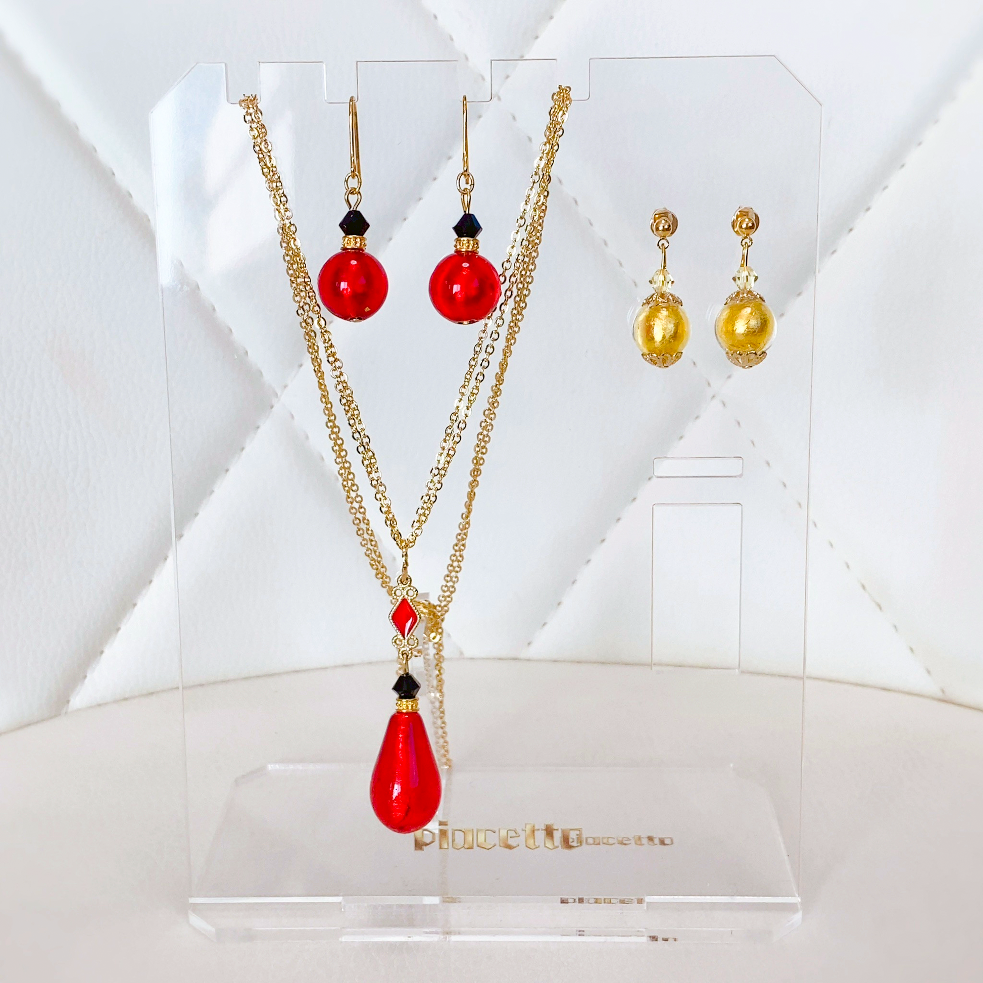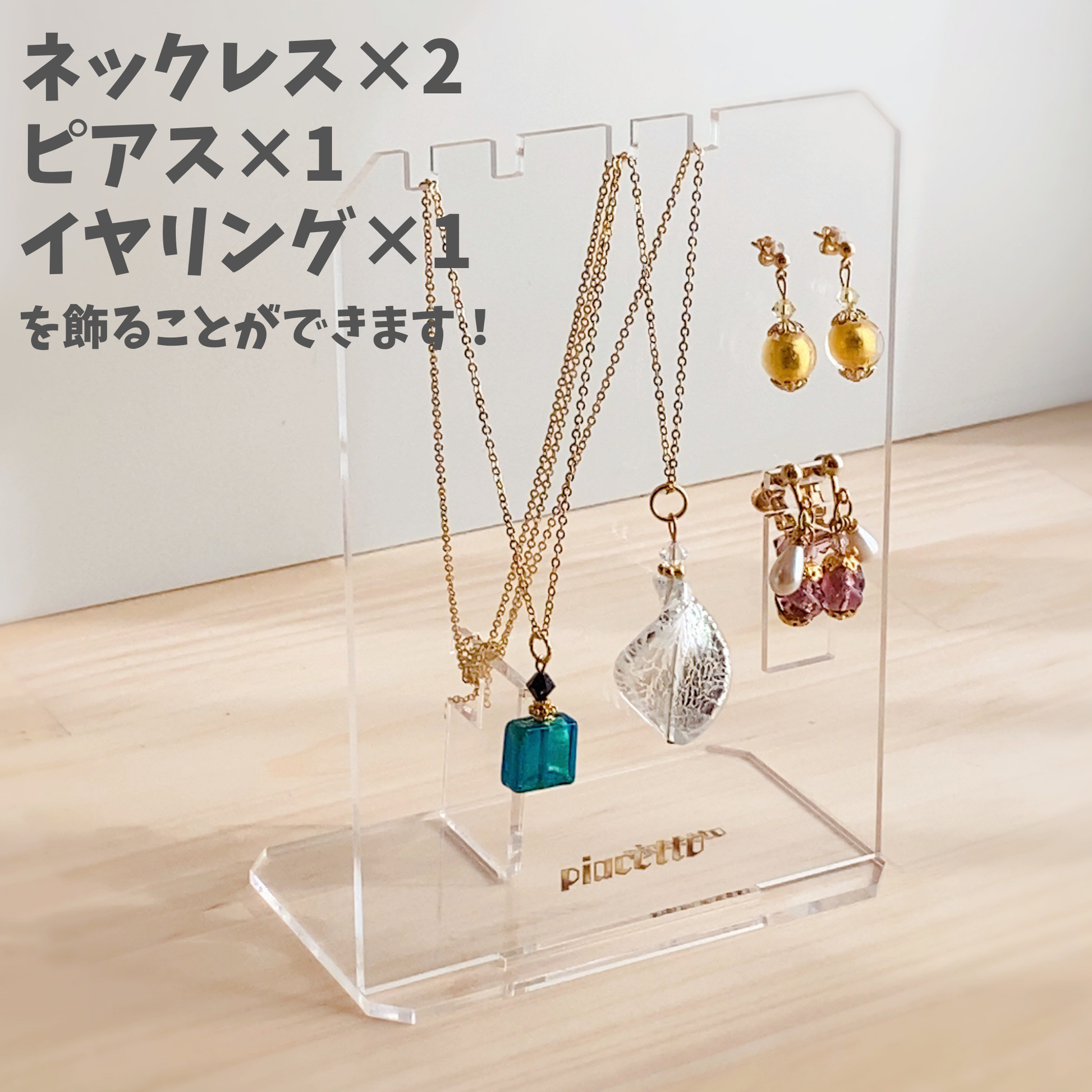 ネックレス2個、ピアス1個、イヤリング1個の最大4個のアクセサリーを同時に飾ることができる、piacettoオリジナルのアクセサリーディスプレイ専用アクリルスタンドをご用意いたしました!