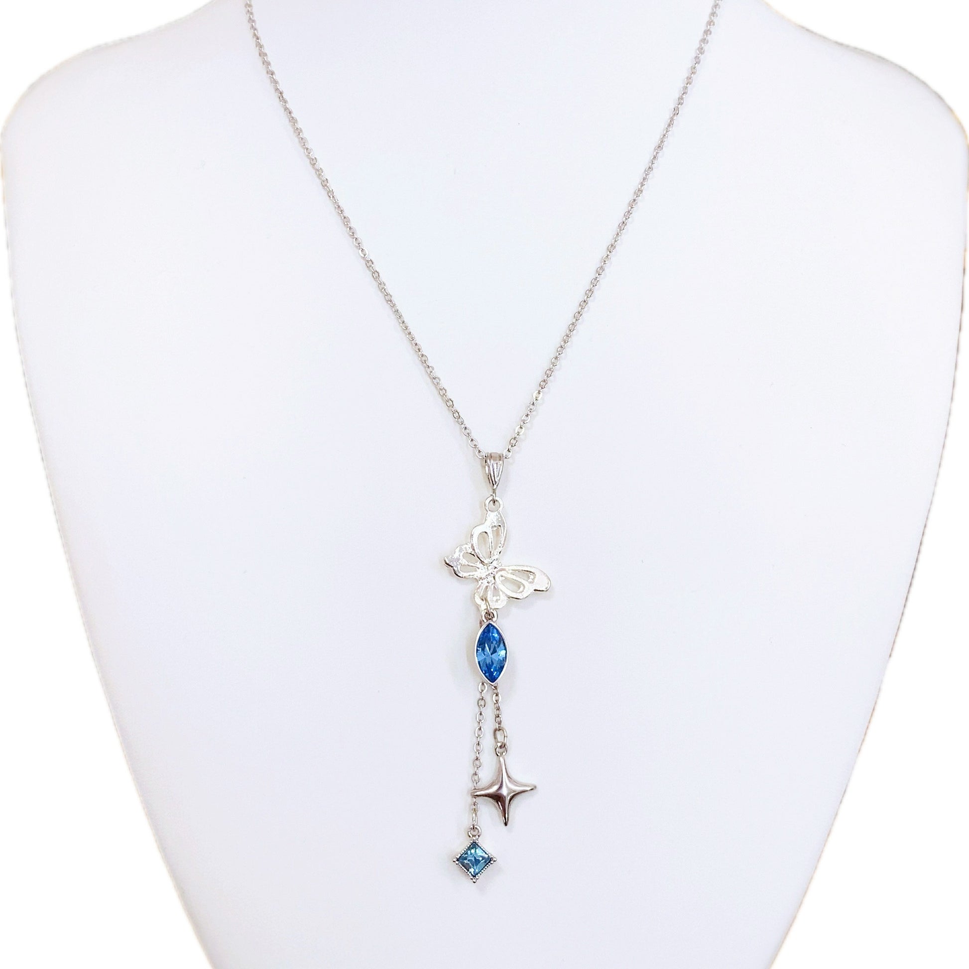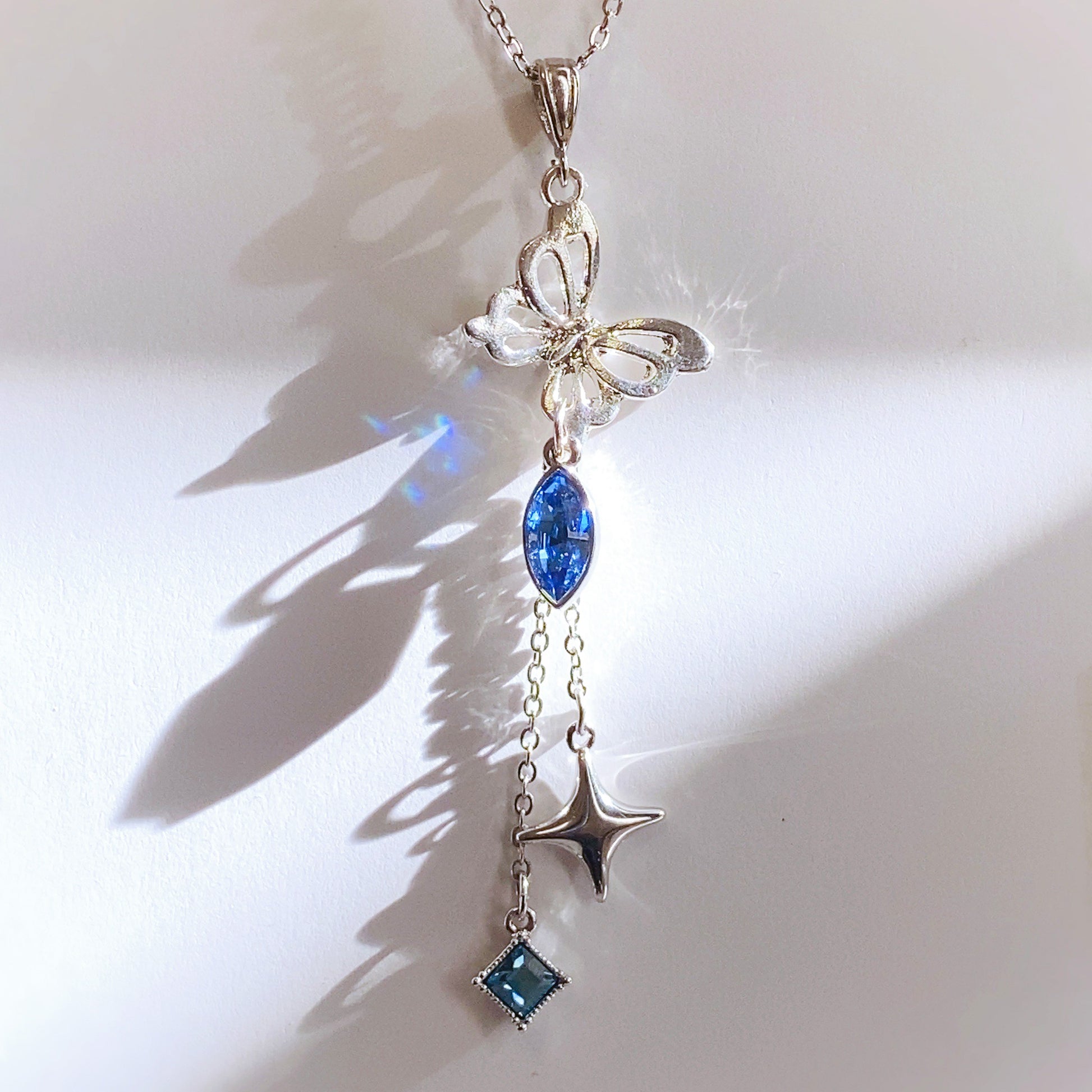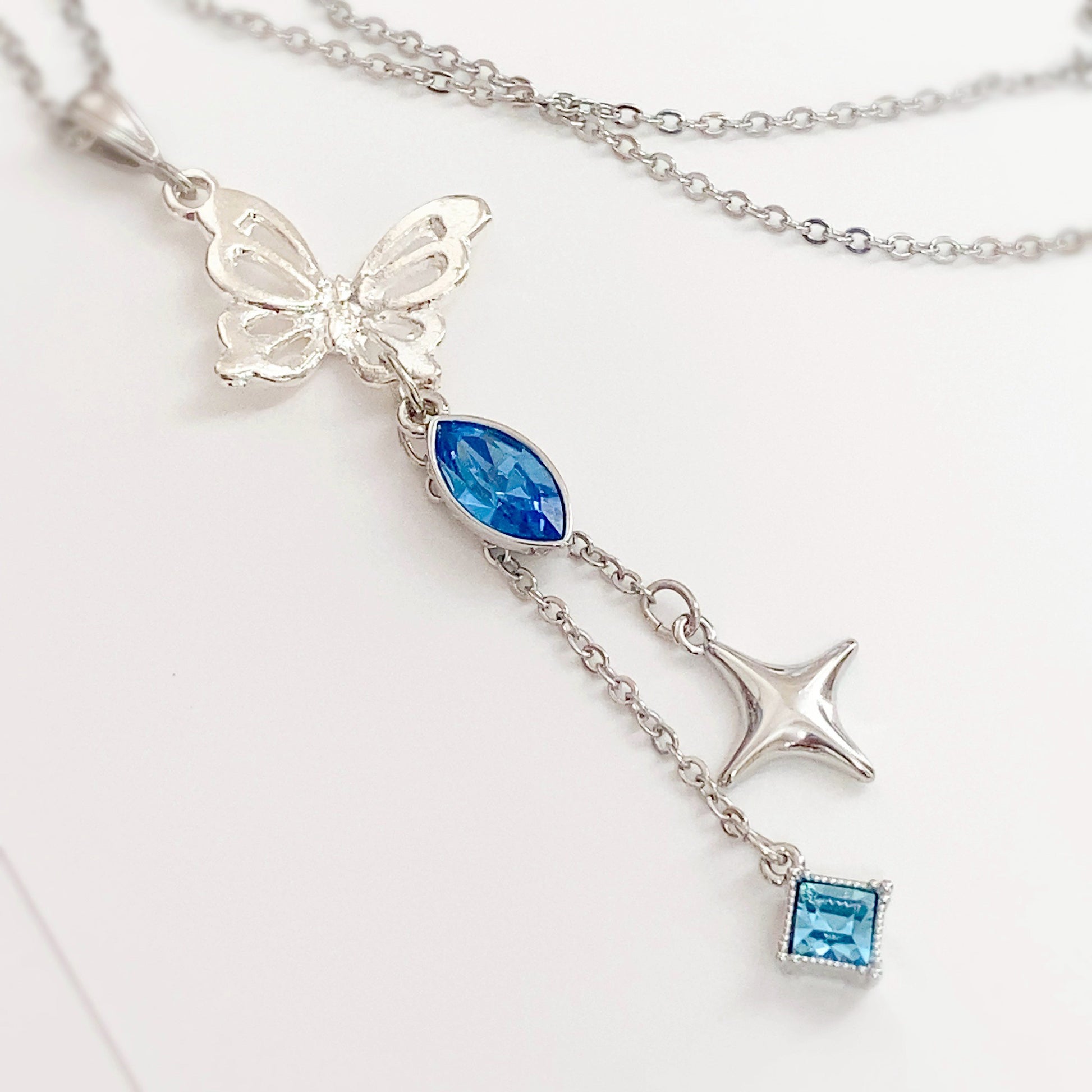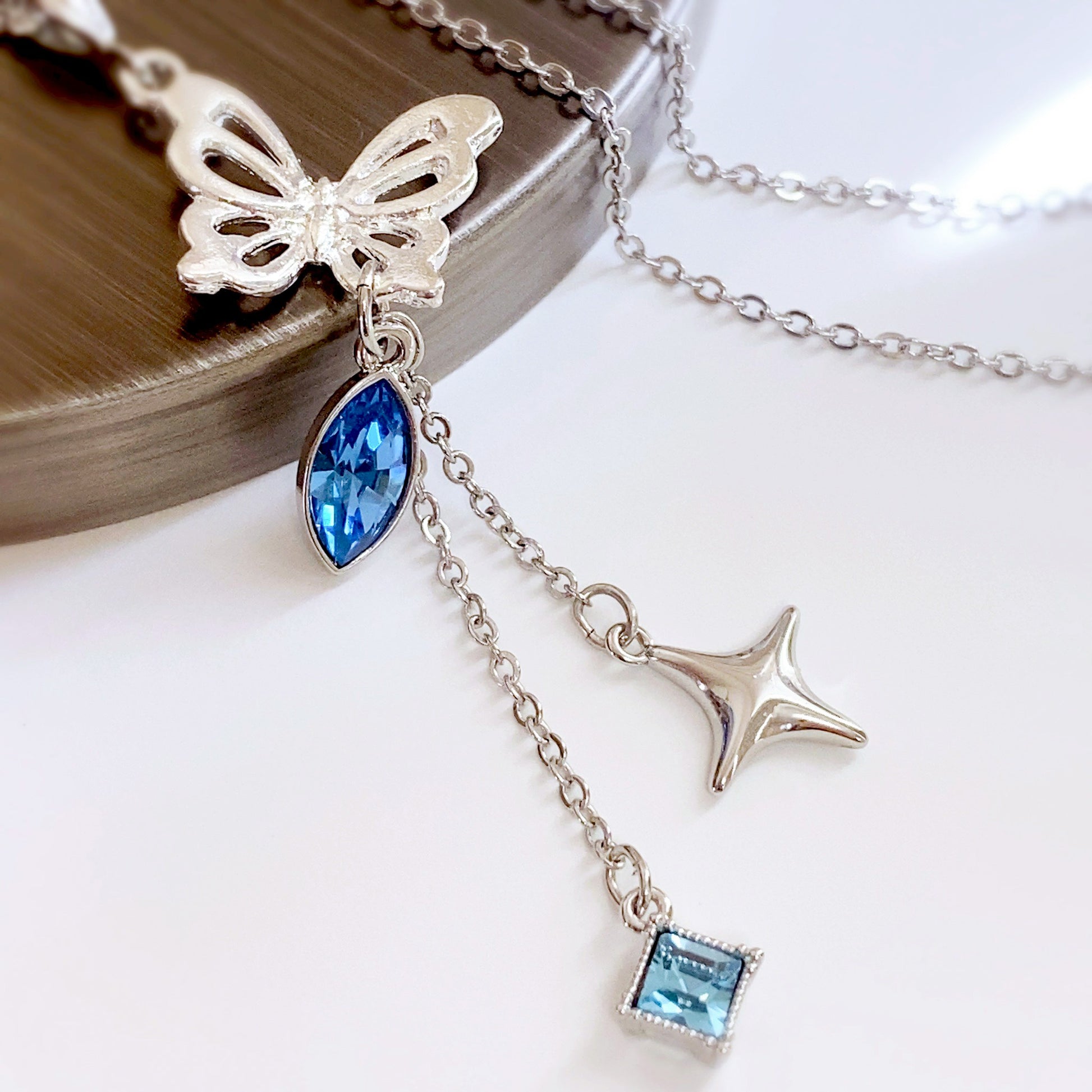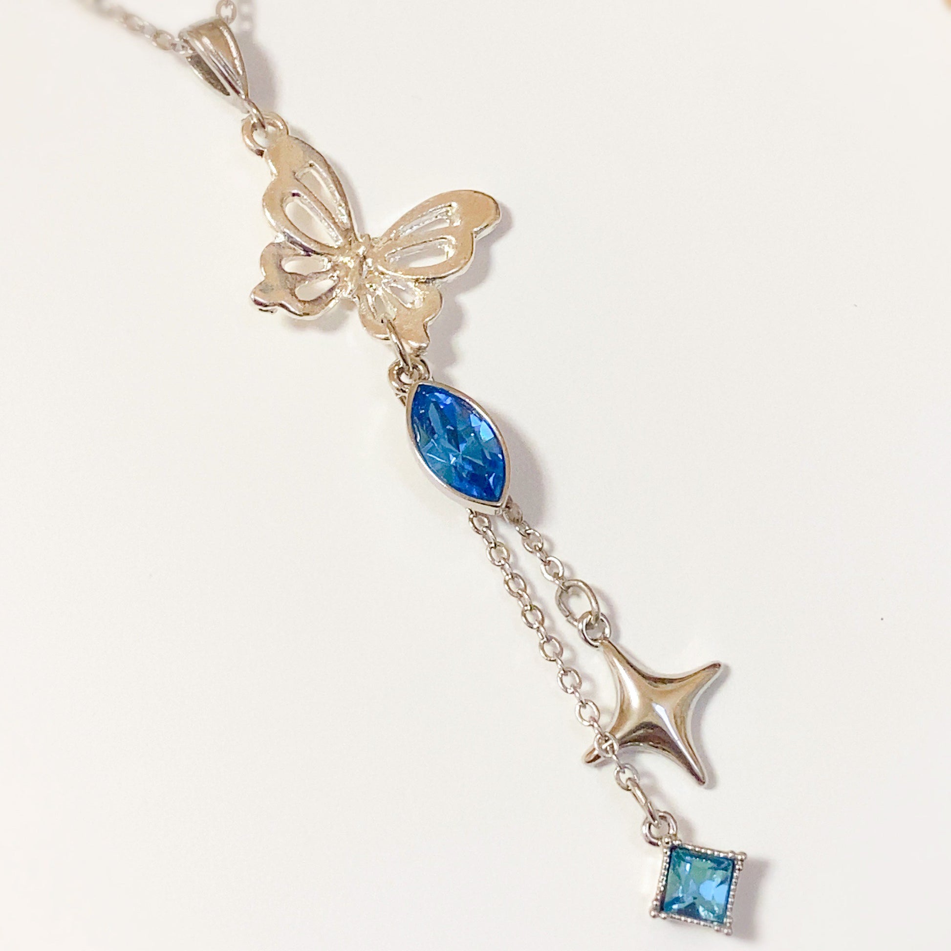 羽ばたくシルバーの蝶々の下で輝くアイスブルーのクリスタルと、揺れるスパークルチャームとダイヤ形クリスタルで上品にまとめました。