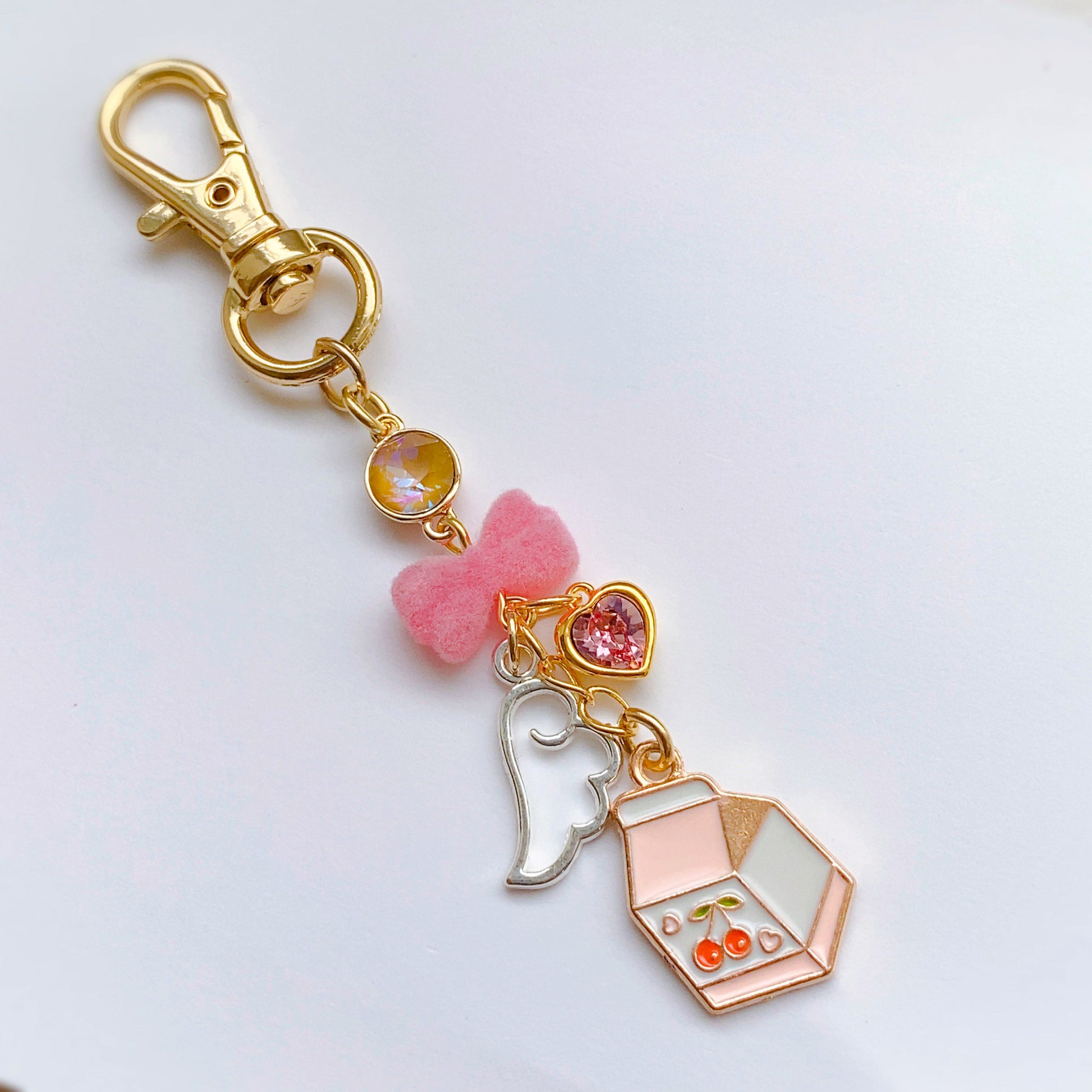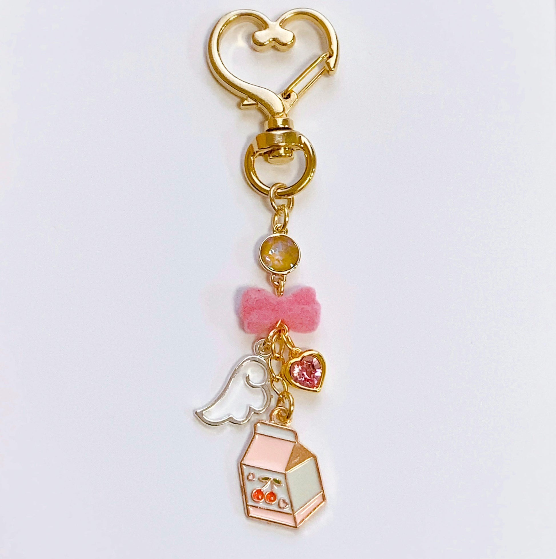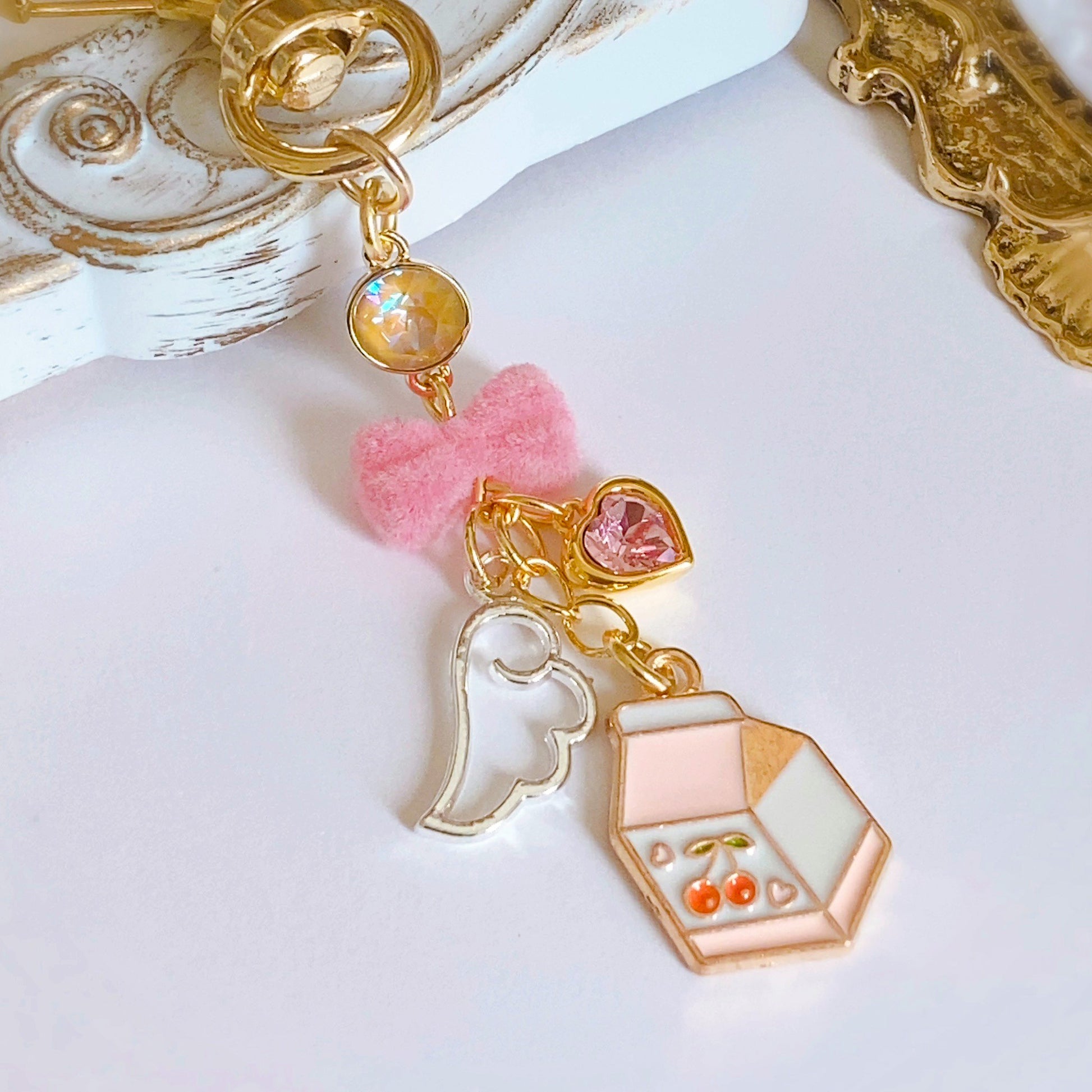 ピンクのフロッキーリボン、愛らしい天使の羽にミルクのチャームが可憐に揺れるデザイン。