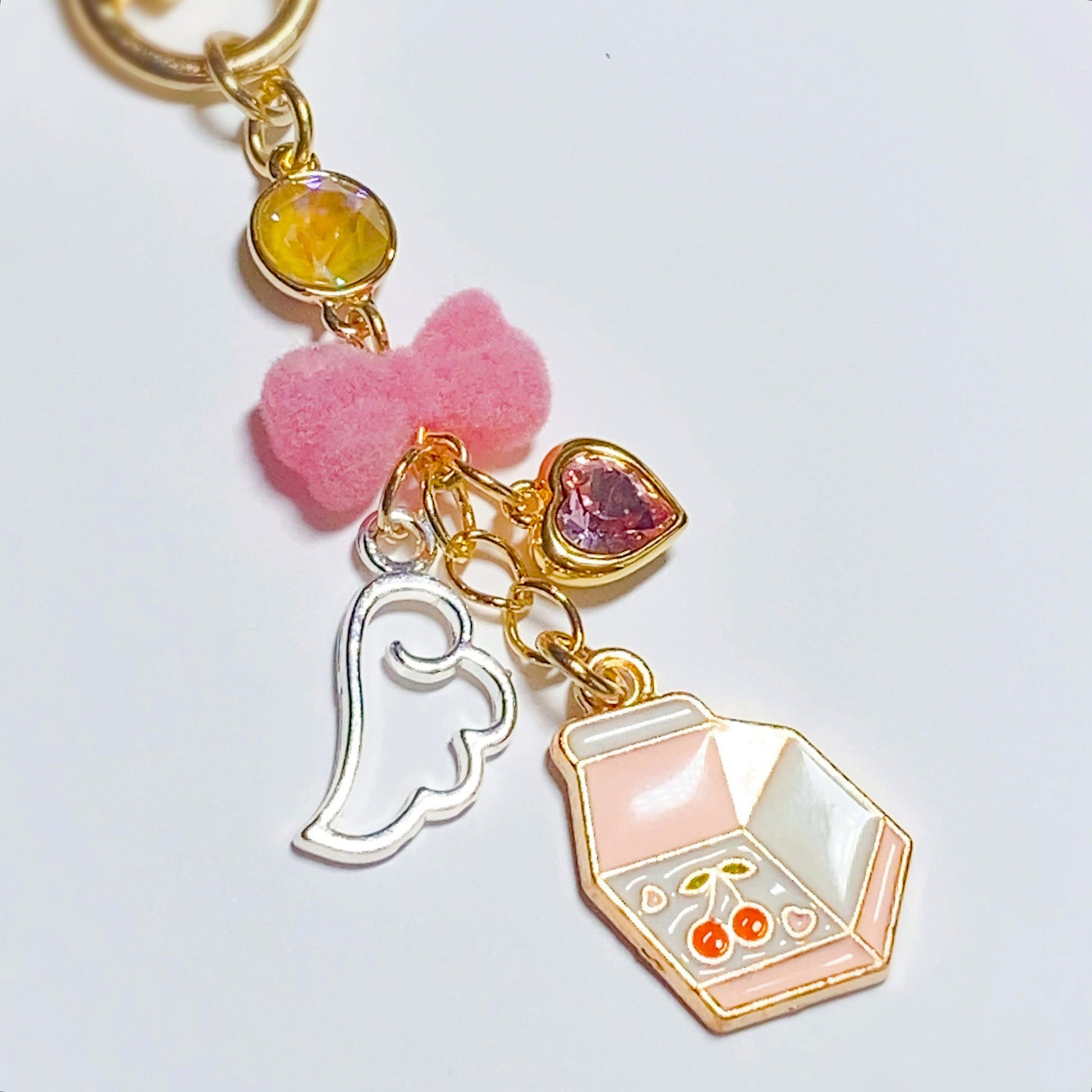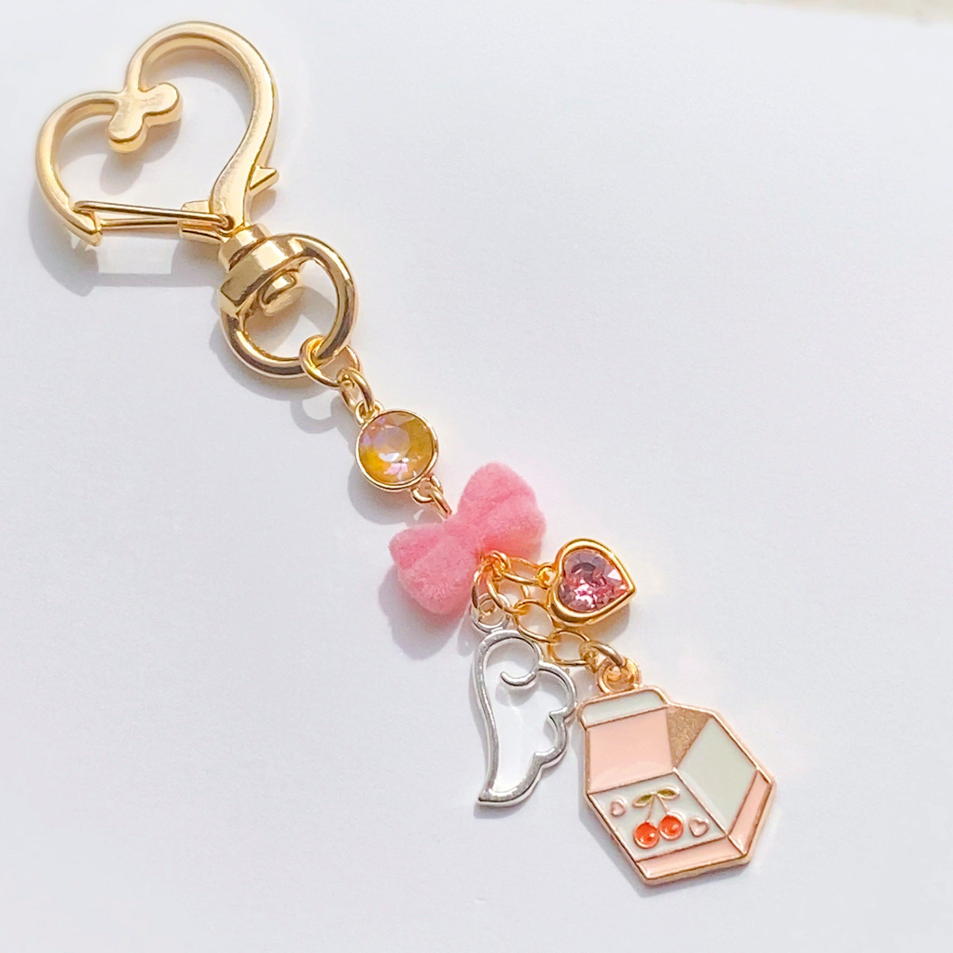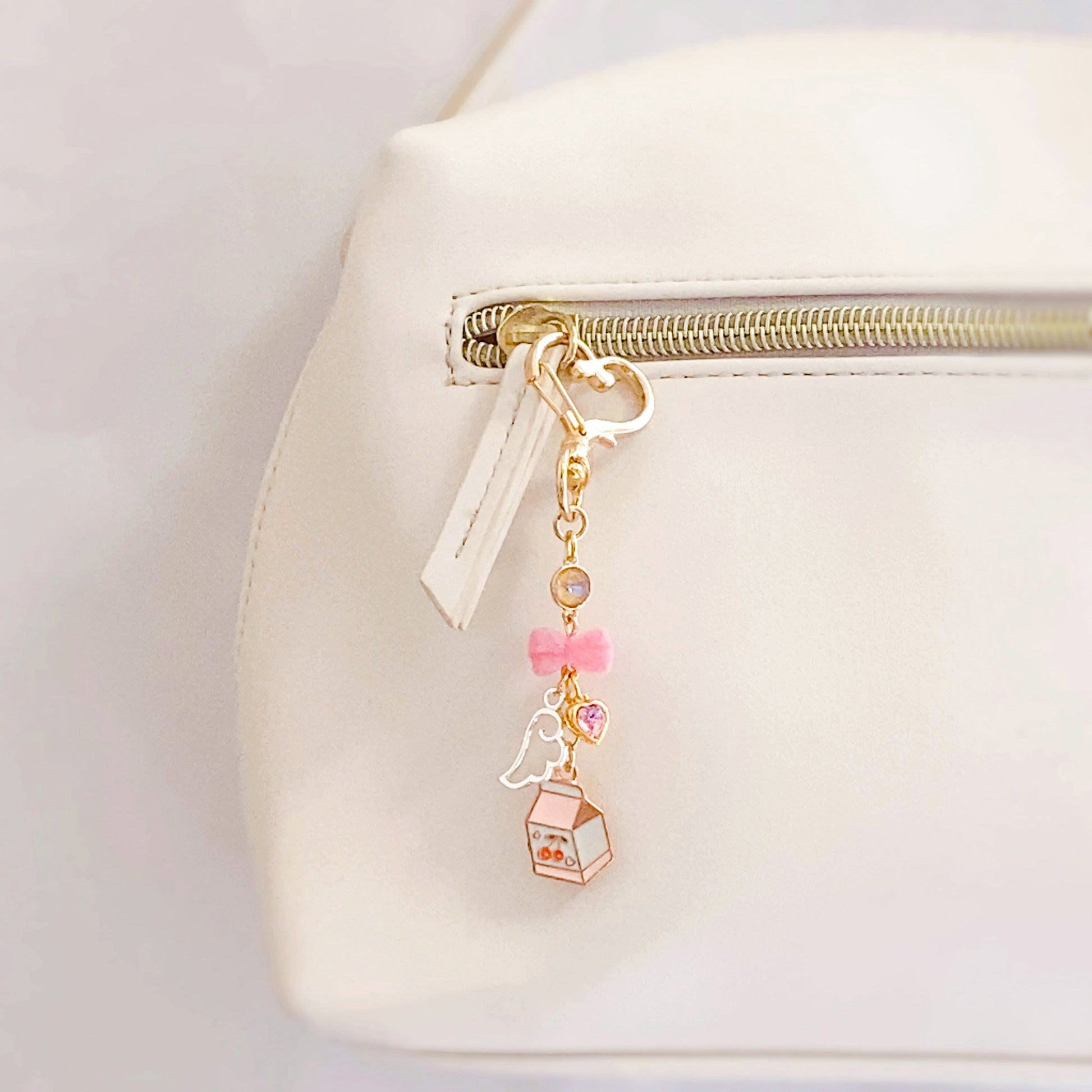 ピンクのフロッキーリボン、愛らしい天使の羽にミルクのチャームが可憐に揺れるデザイン。