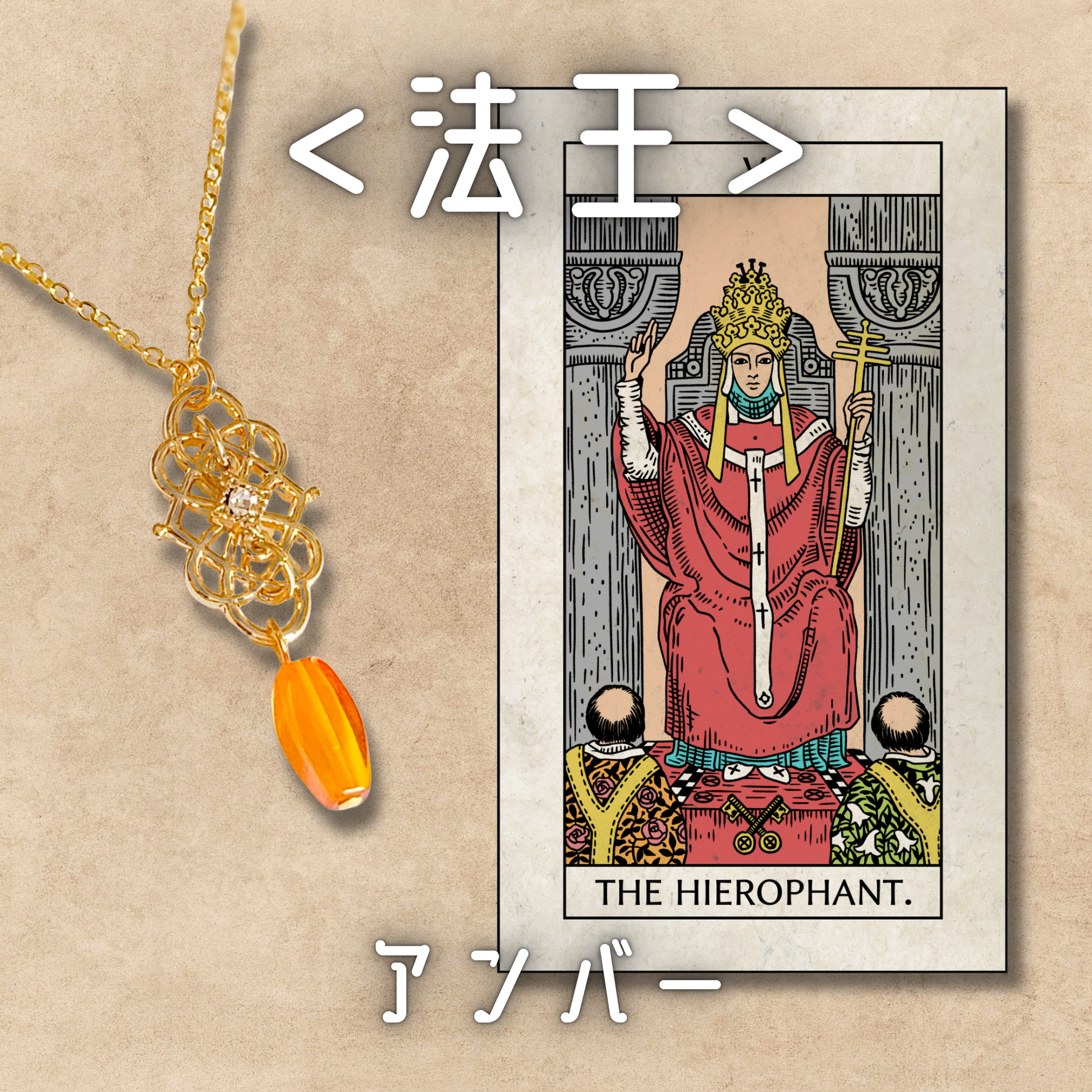 法王の象徴する「教え・伝統」と深くリンクする意味を持つ、[琥珀(アンバー)]を使ってデザインしました。琥珀には「太古の記憶」や「魂の癒し」の力があると言われており、 形式や知恵を通して人に安心をもたらす役割を果たしたい人にとって、琥珀はまさに自然の導師のような石です。