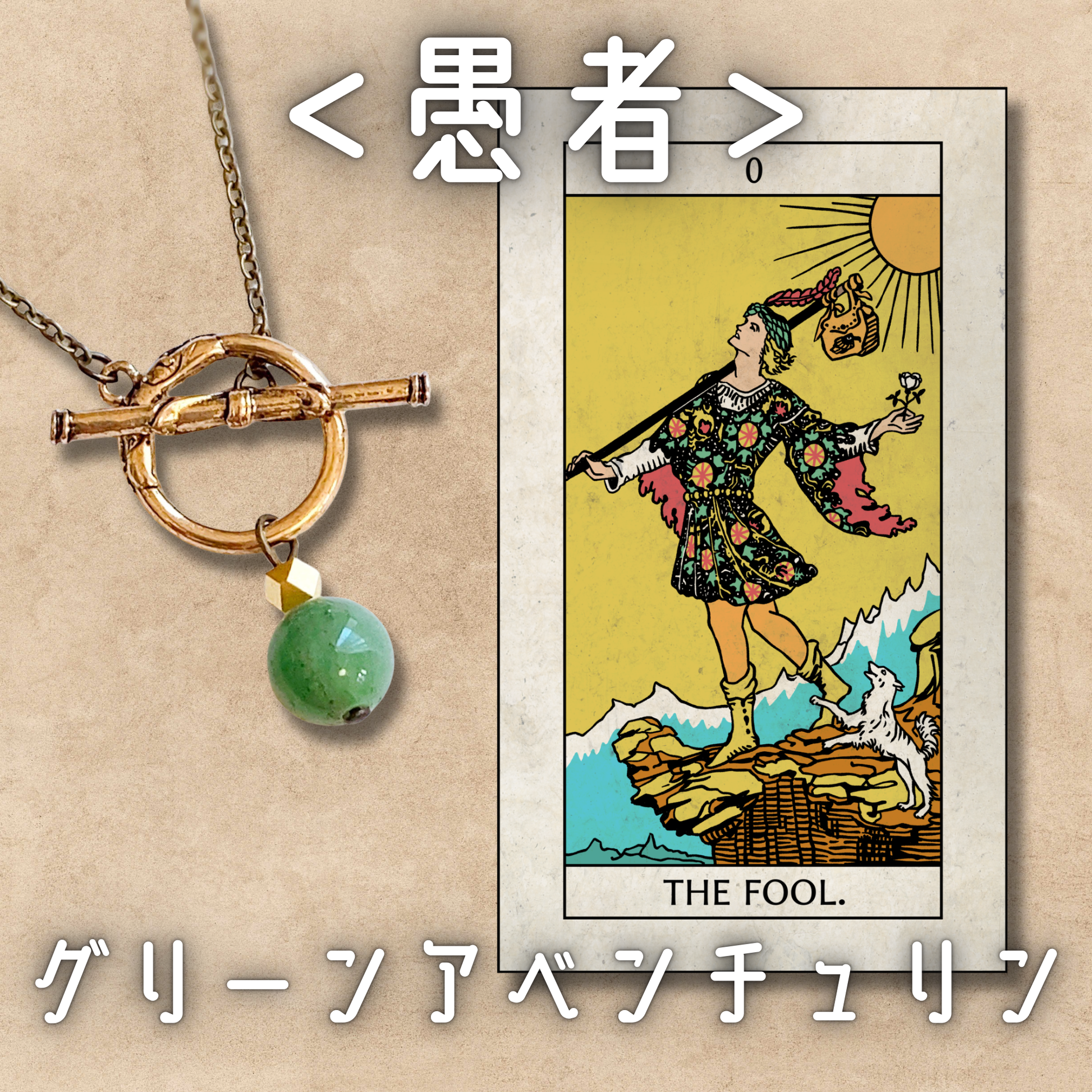 愚者のカードと共通する「自由」や「冒険」という石言葉を持つ天然石、[アベンチュリン]を使用。荷物をぶら下げた木の棒を軽そうに持って旅をしている姿をモチーフに、マンテルを使用してデザインしました。通常のネックレスのようにヒキワとアジャスターを使って仕上げておりますが、フロントのマンテルからでも着脱が可能です。
