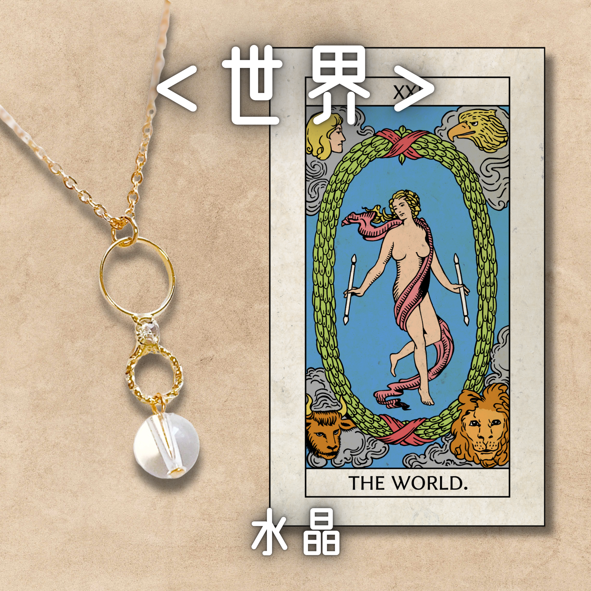 澄んだ輝きの水晶を主役にデザインしました。水晶はあらゆるパワーストーンの中でも特別な存在であり、「万能の石」「すべてを調和させる石」と称されます。さらに、「世界」が象徴する全体性・統合された自己を体現するもの。調和と永続性をイメージして、ふたつのリングパーツと組み合わせました。