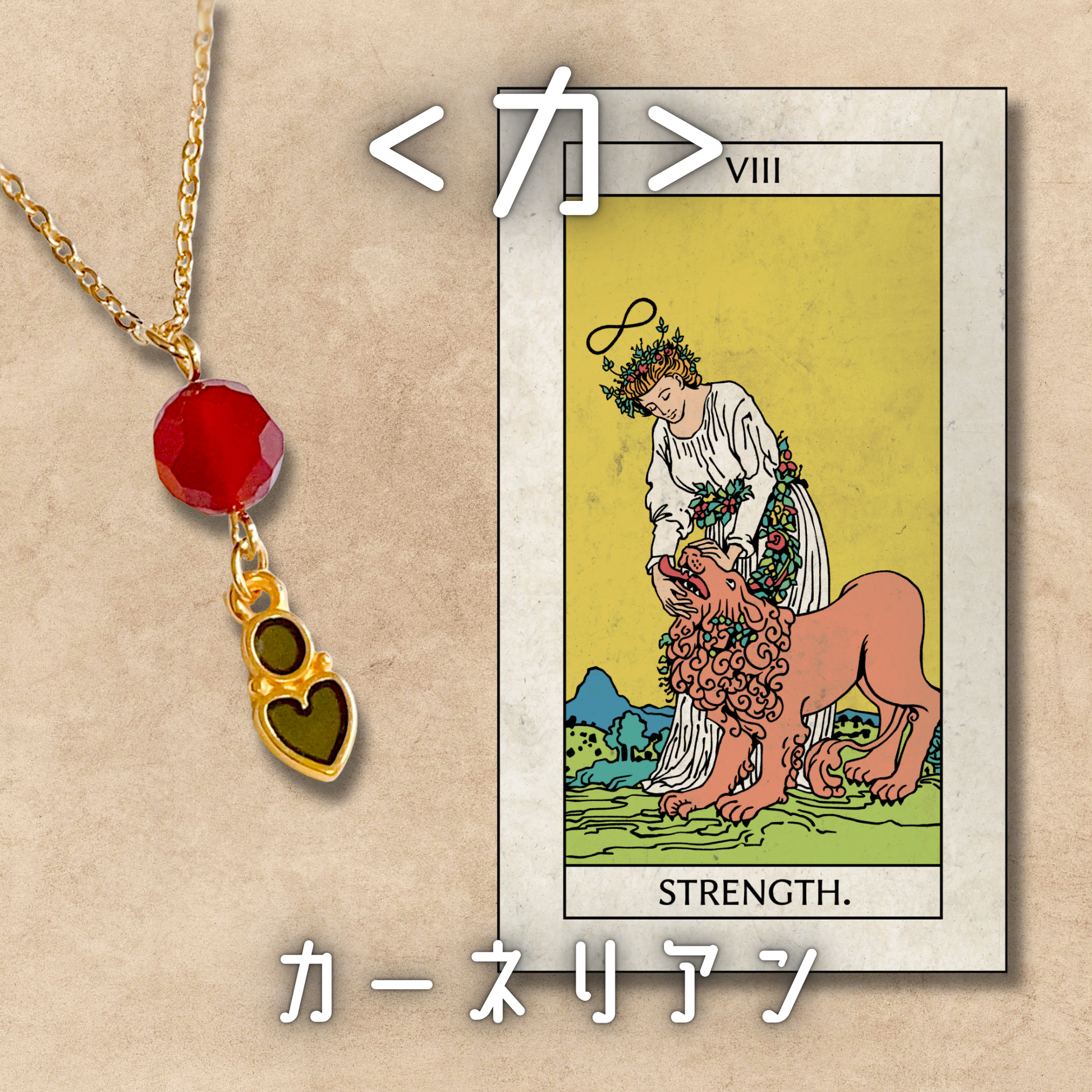 【力】のカードが恋愛において正位置で表示されると、意中の相手と両思いになることや、より深い絆を育めることを示すケースが多くなっています。このカードをモチーフにしたアミュレットに使用している天然石は、[カーネリアン]。「内なる勇気」「心の強さ」などの意味を持ちます。その力を発揮できるよう、ハートのシックなチャームを合わせてデザインしました。