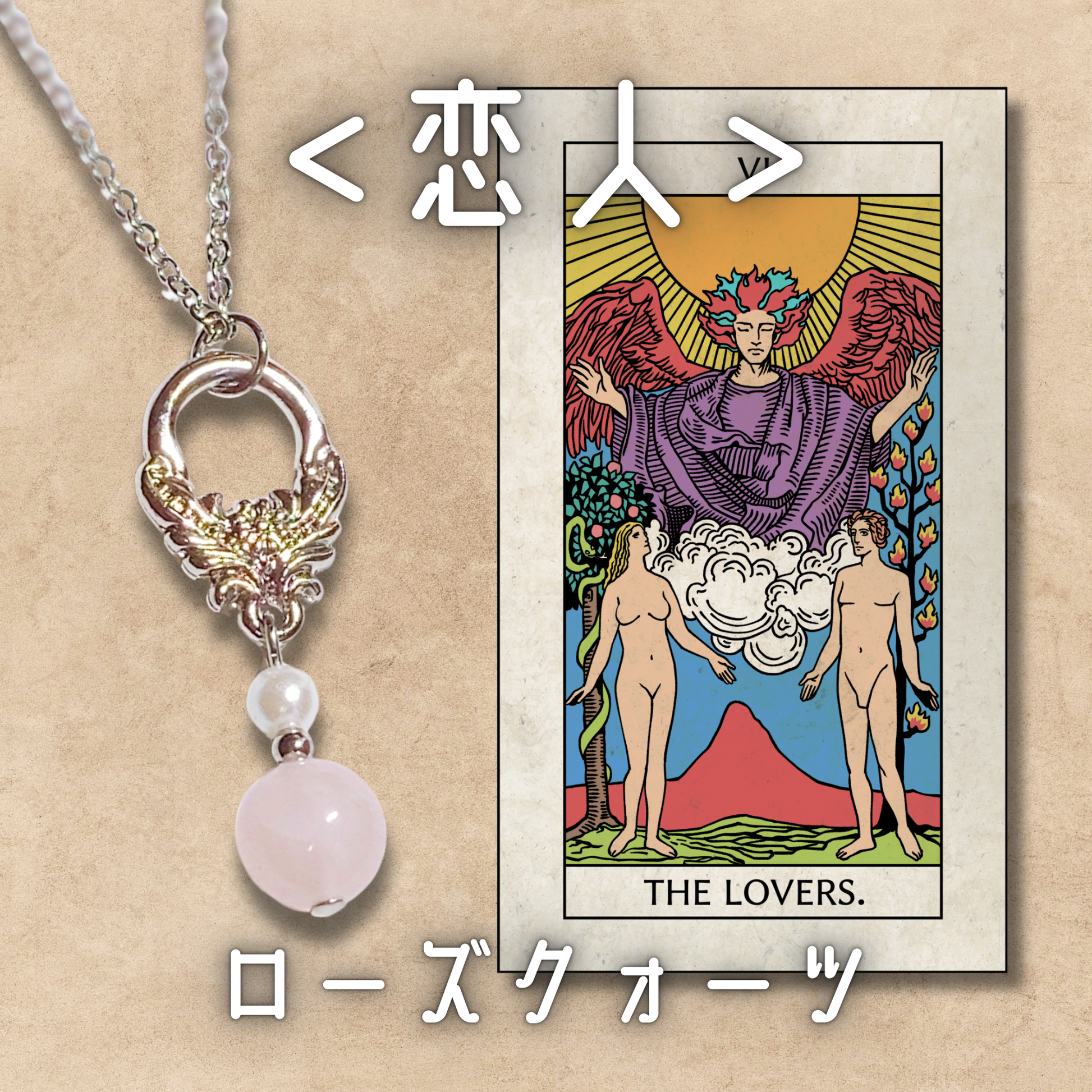 【恋人】のカードは、恋愛テーマの象徴ともいえ、調和・相思相愛・運命的な出会いを示します。お互いに引き合うエネルギーや、心からの信頼、選び取る勇気といった要素が含まれています。そんなカードをモチーフにしたアミュレットに使用した天然石は[ローズクォーツ]。「恋愛のお守り」として最も有名な天然石のひとつです。「自分を愛し、人を愛する」力を育てる石のため、「出会いを引き寄せたい人」「恋を成就させたい人」にぴったりです。