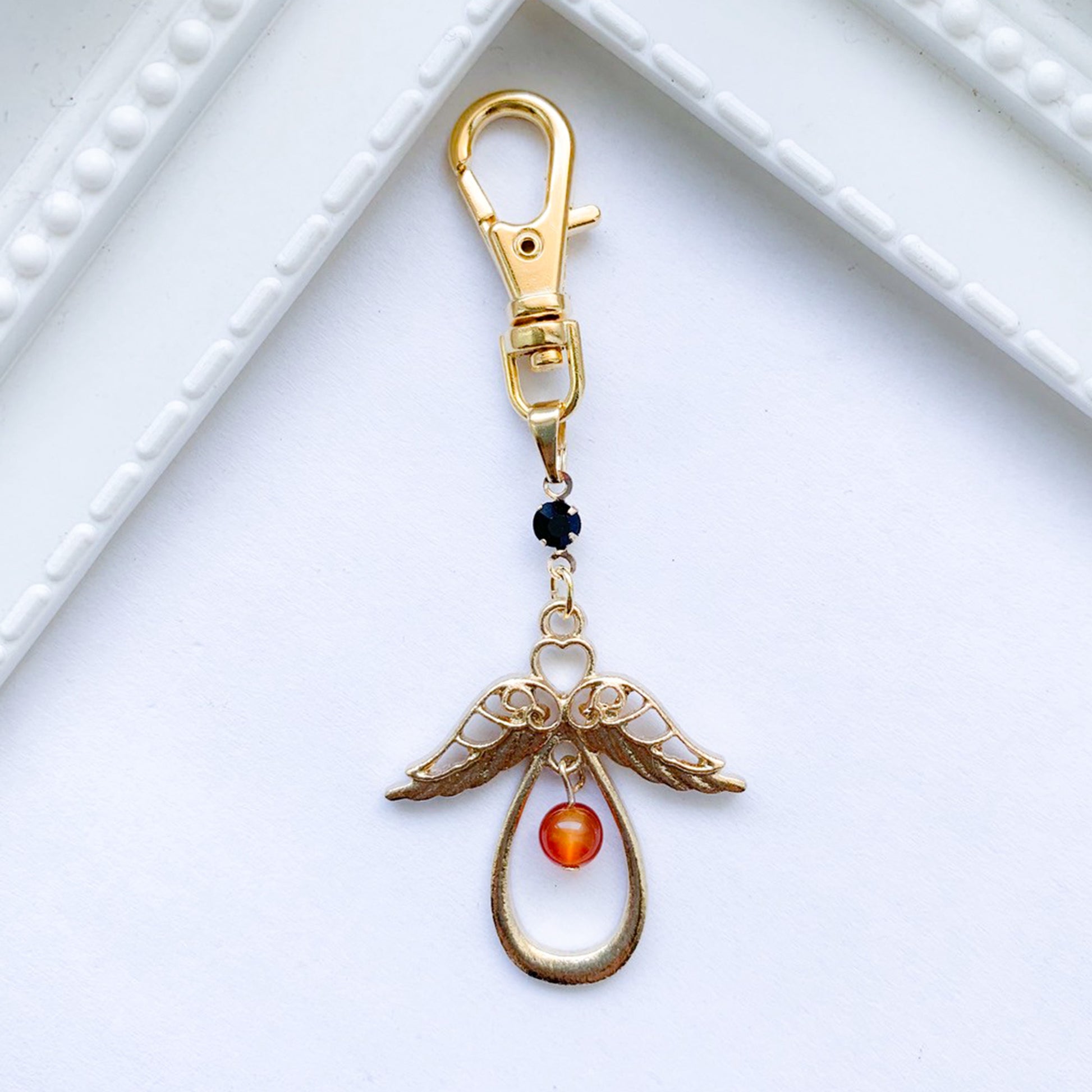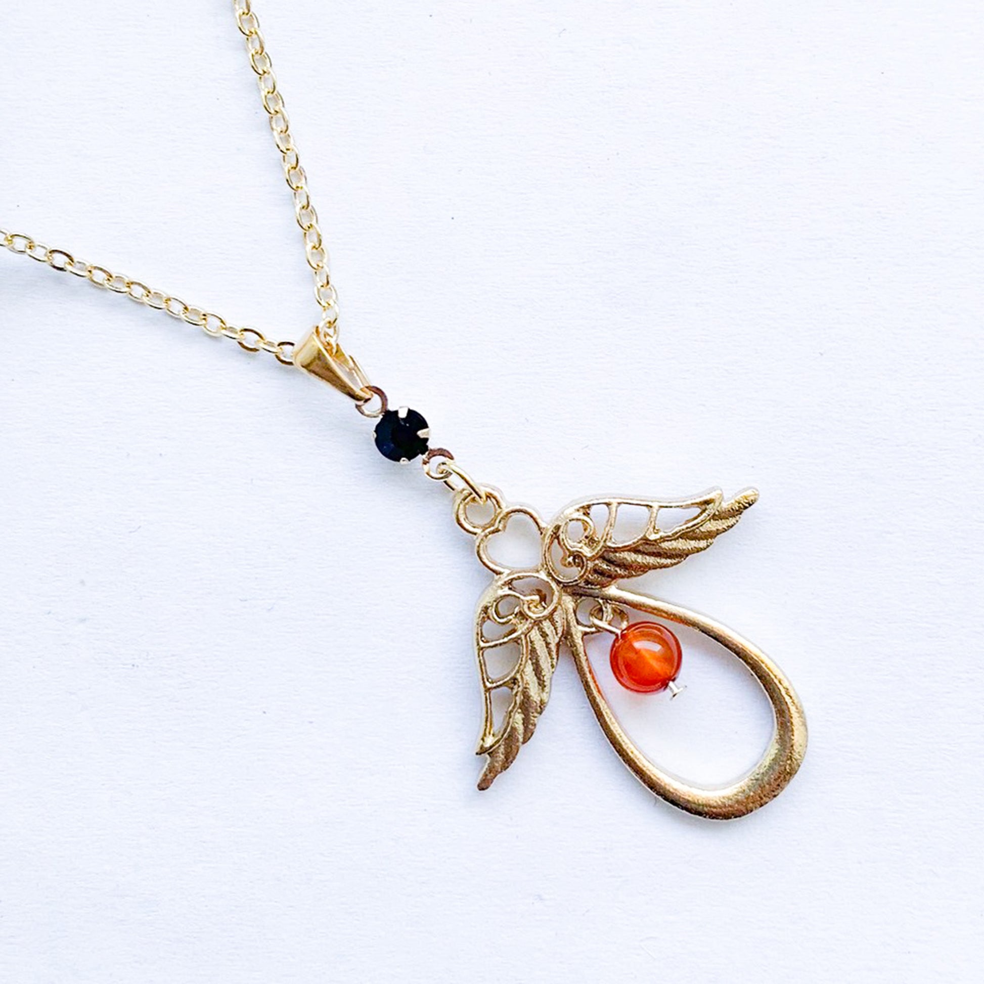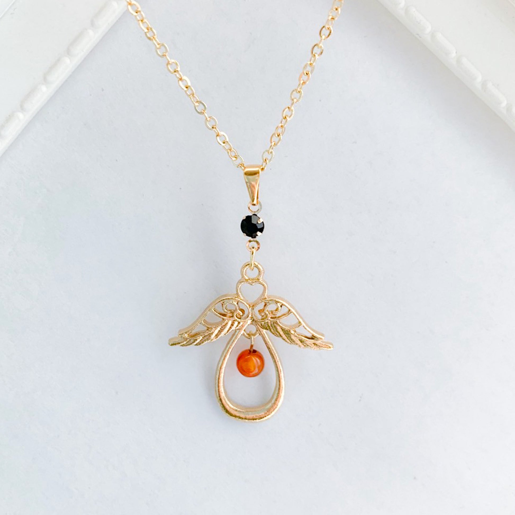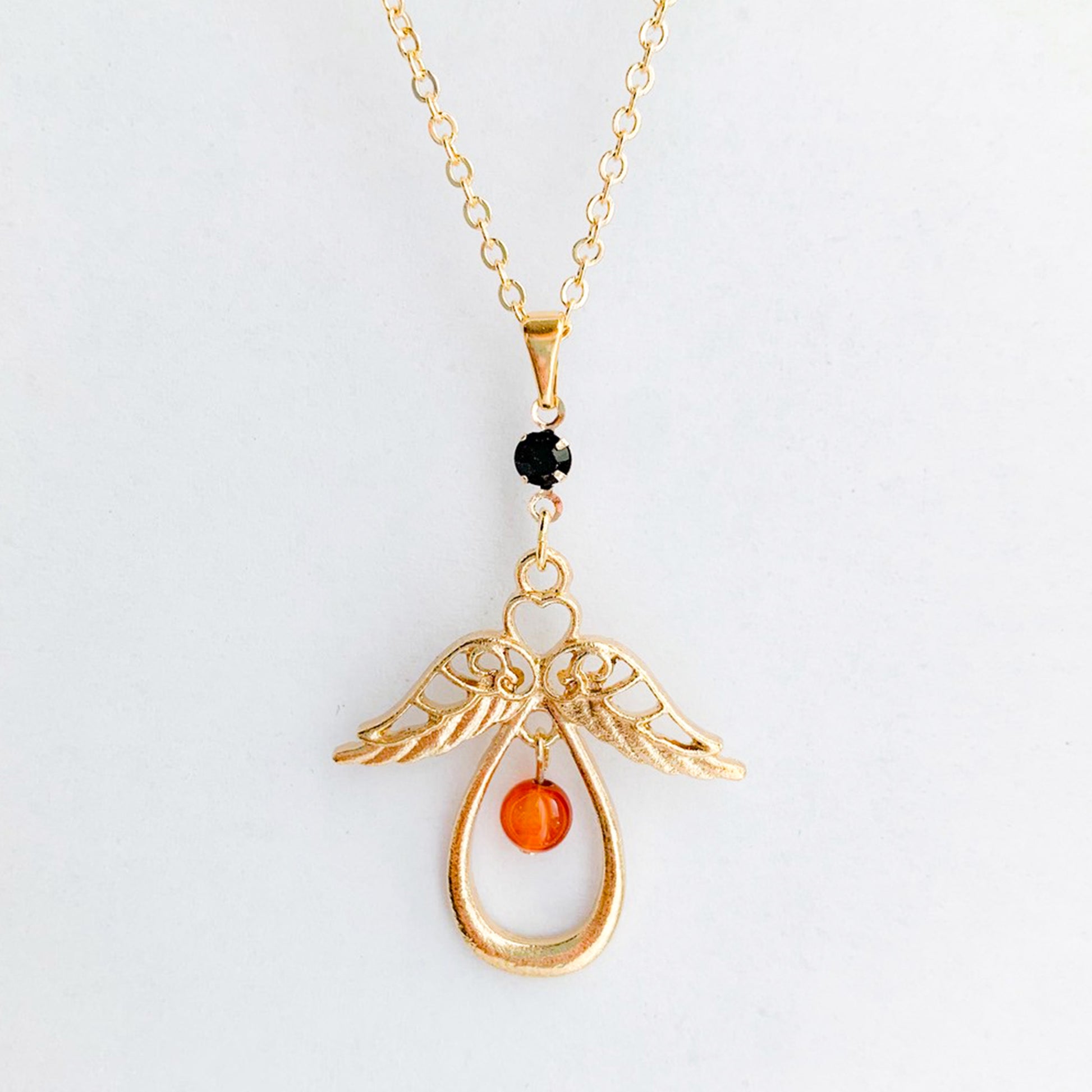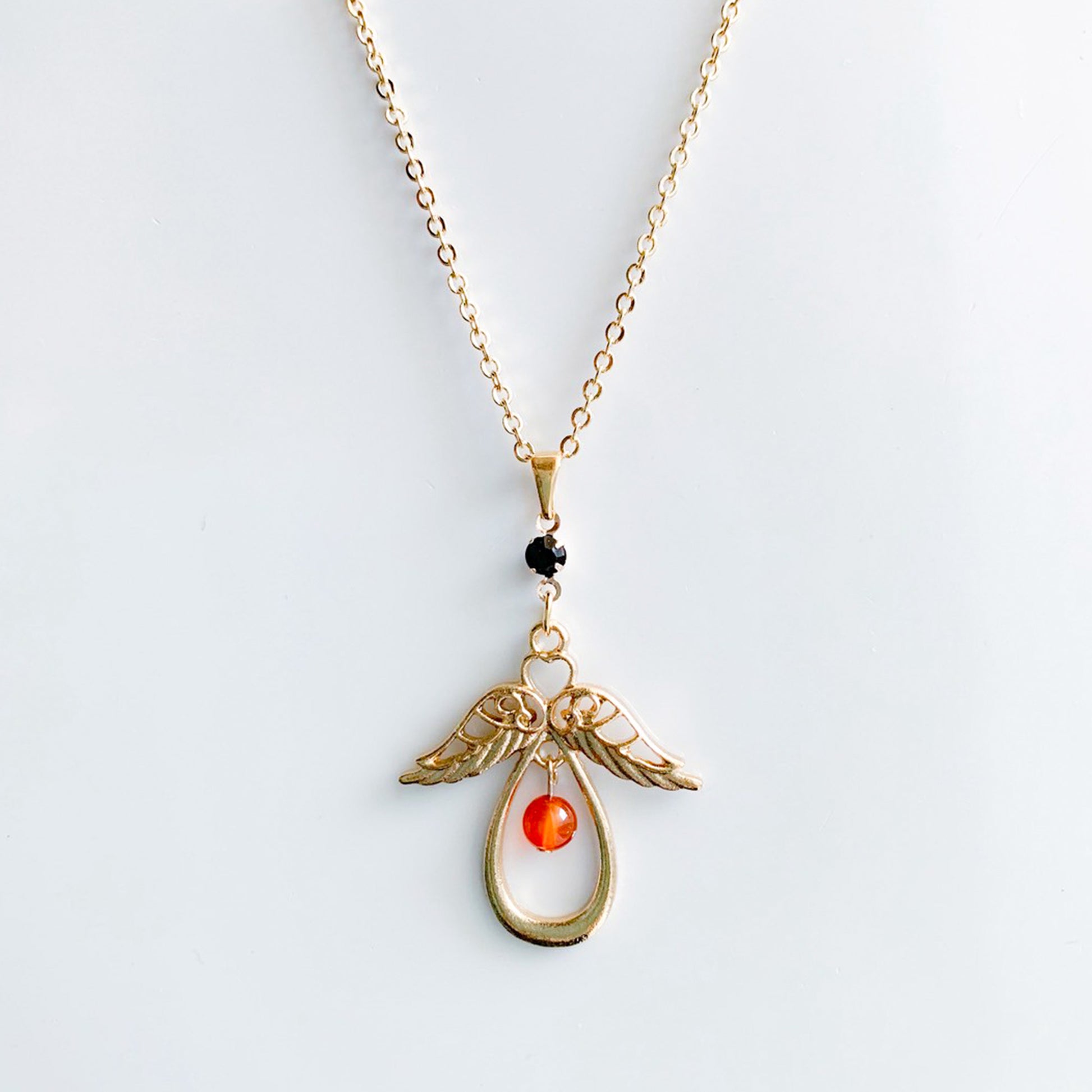 エンジェルエッグのフレームの中に揺れるのはオレンジ色の天然石、[カーネリアン]。