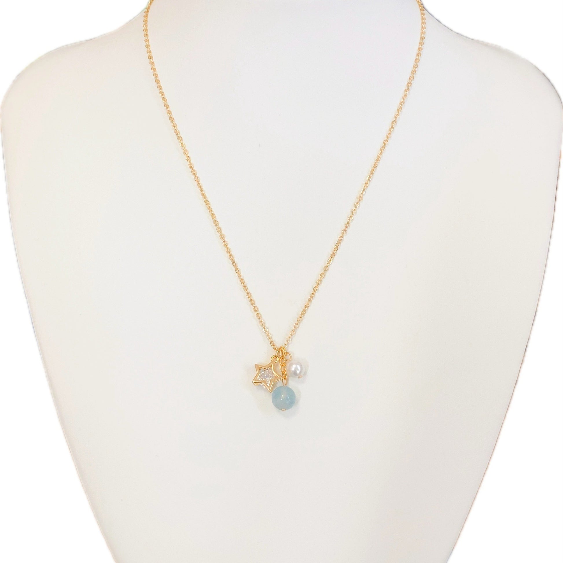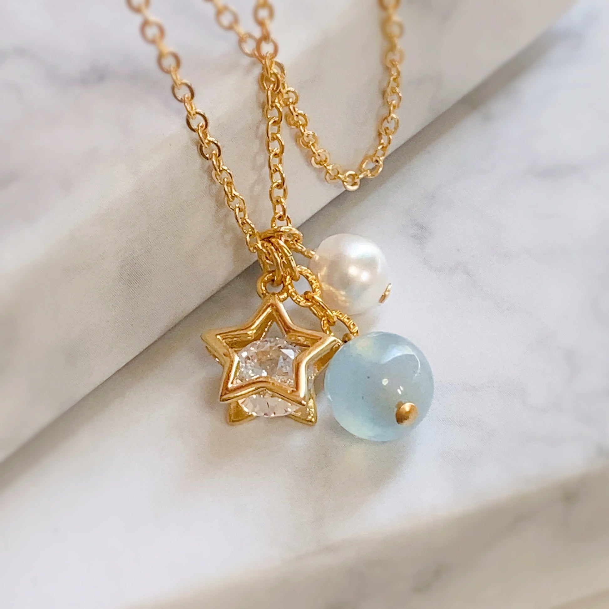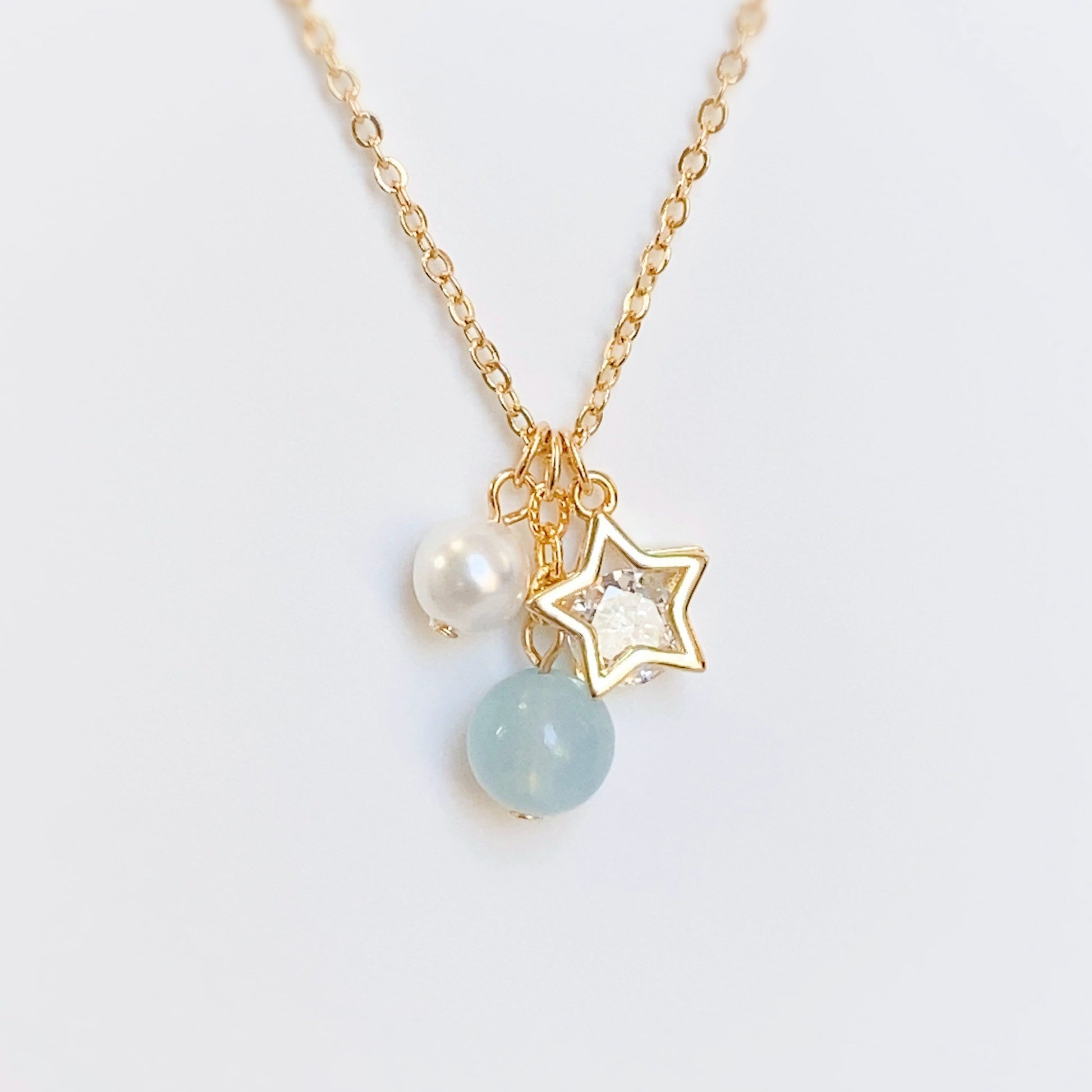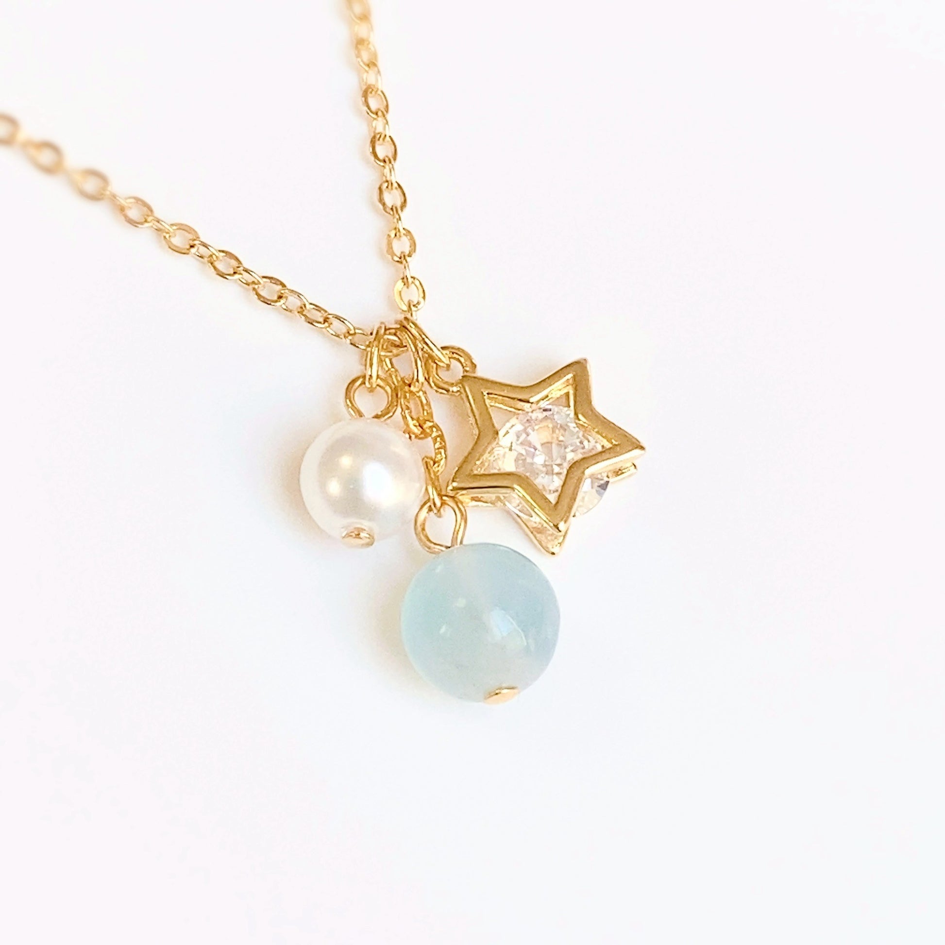 パールとジルコニア入りのスターチャームをイメージチャームに使用し、主役は天然石の[アクアマリン]。