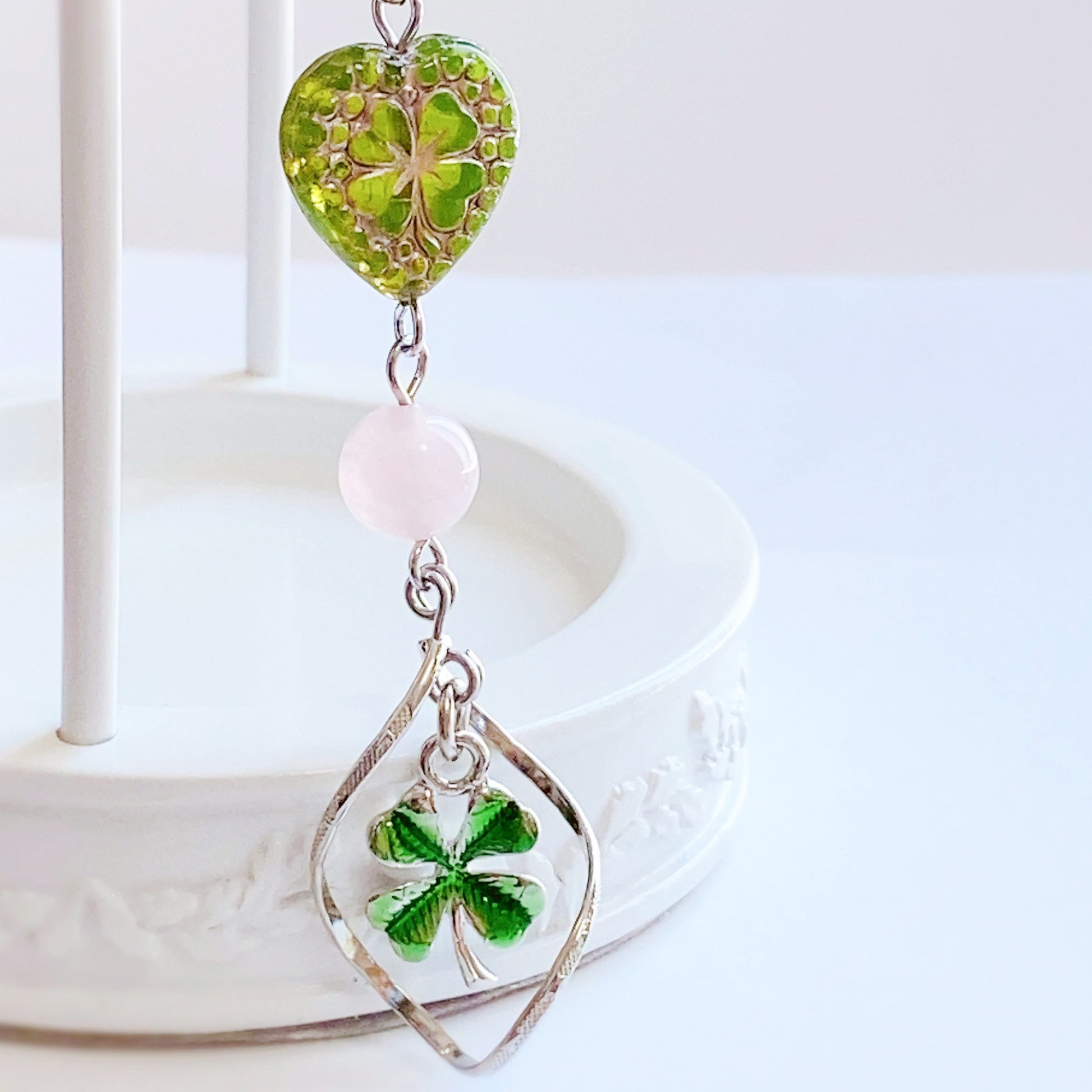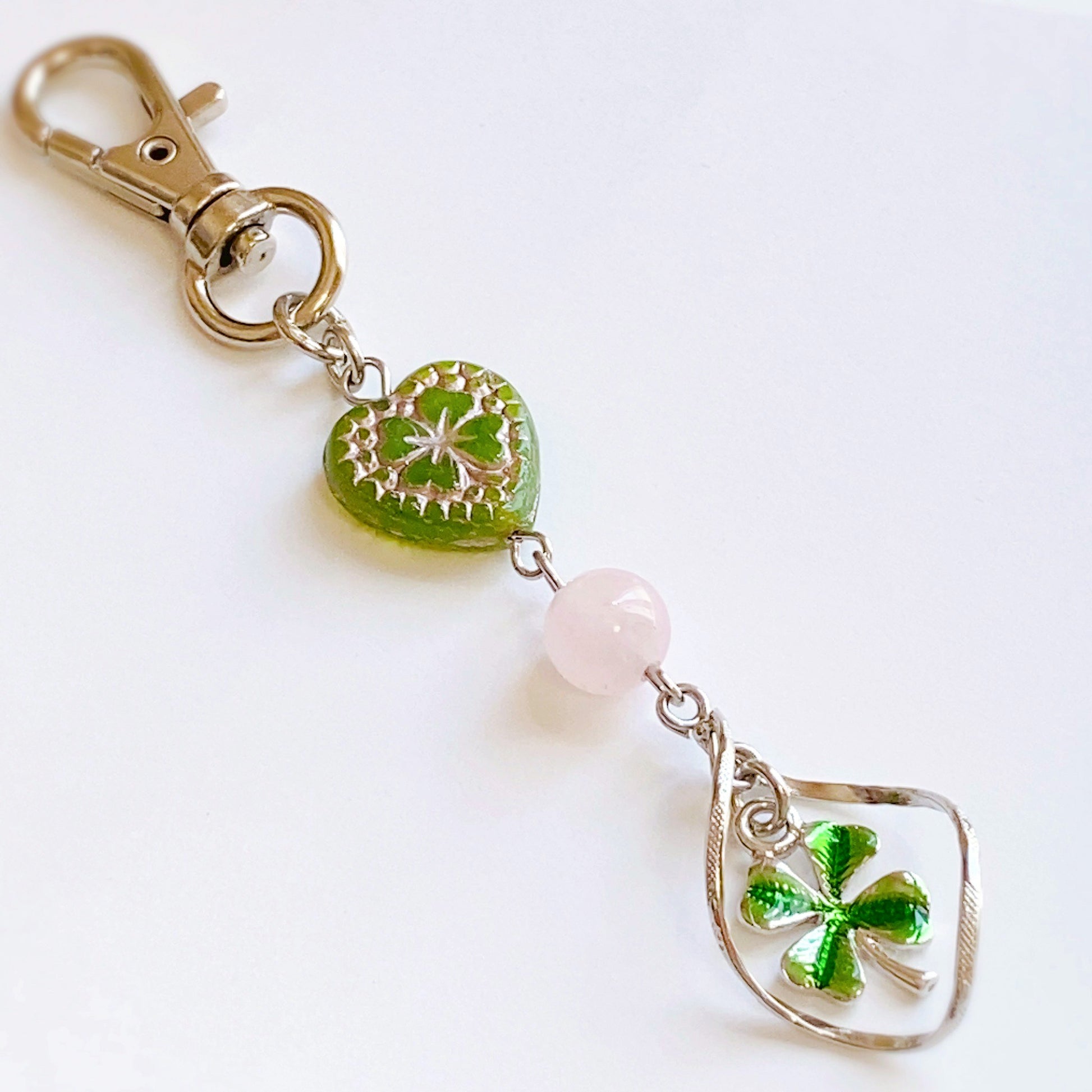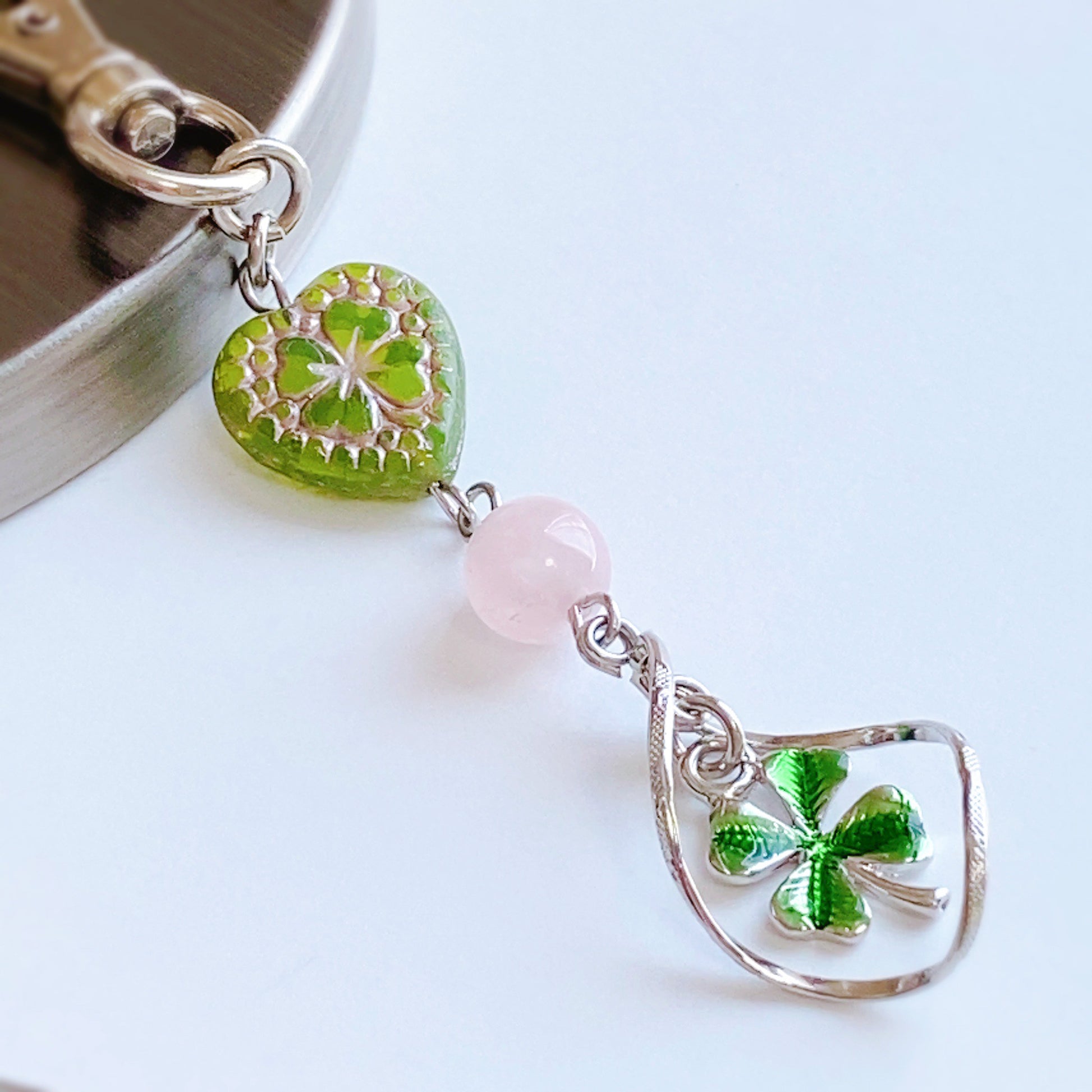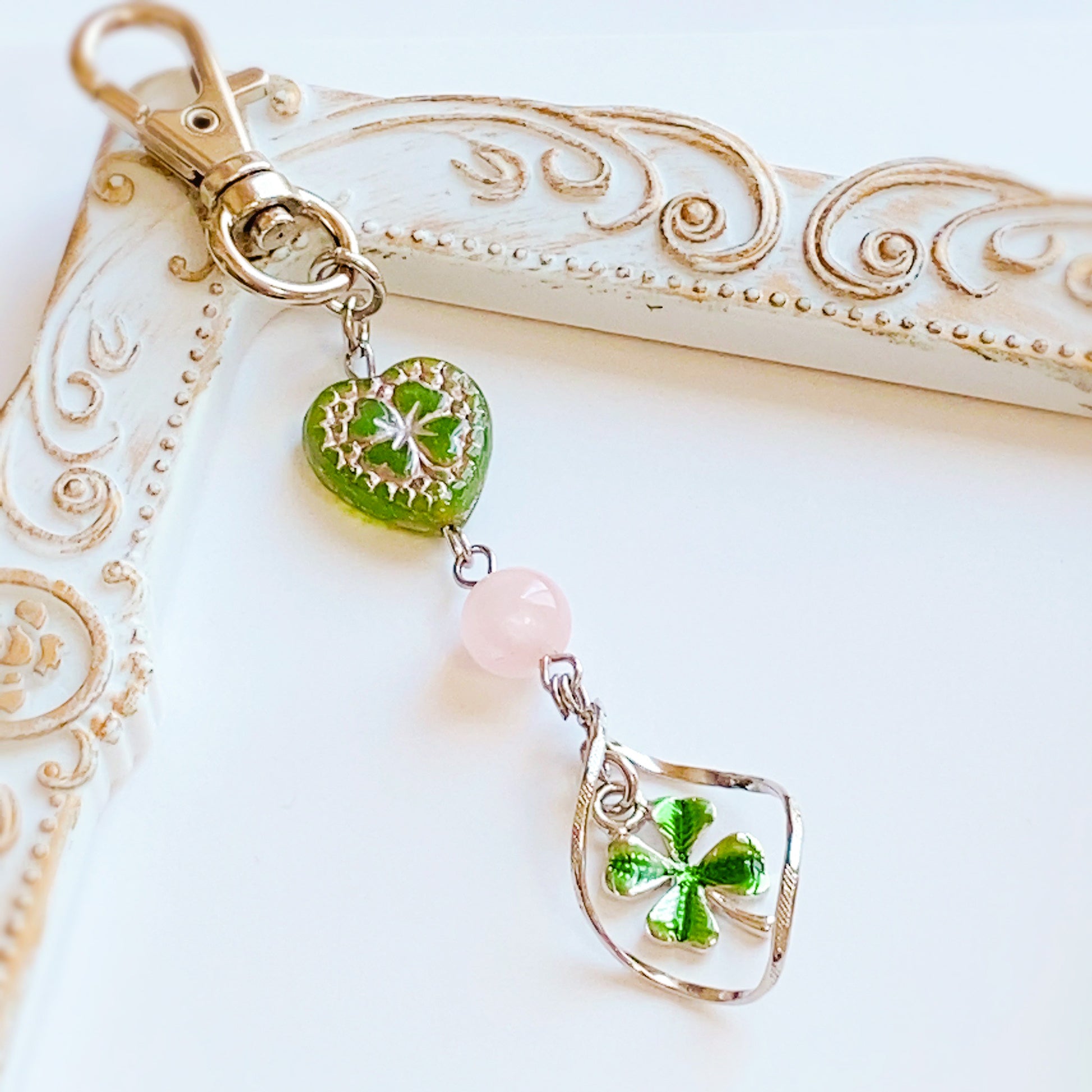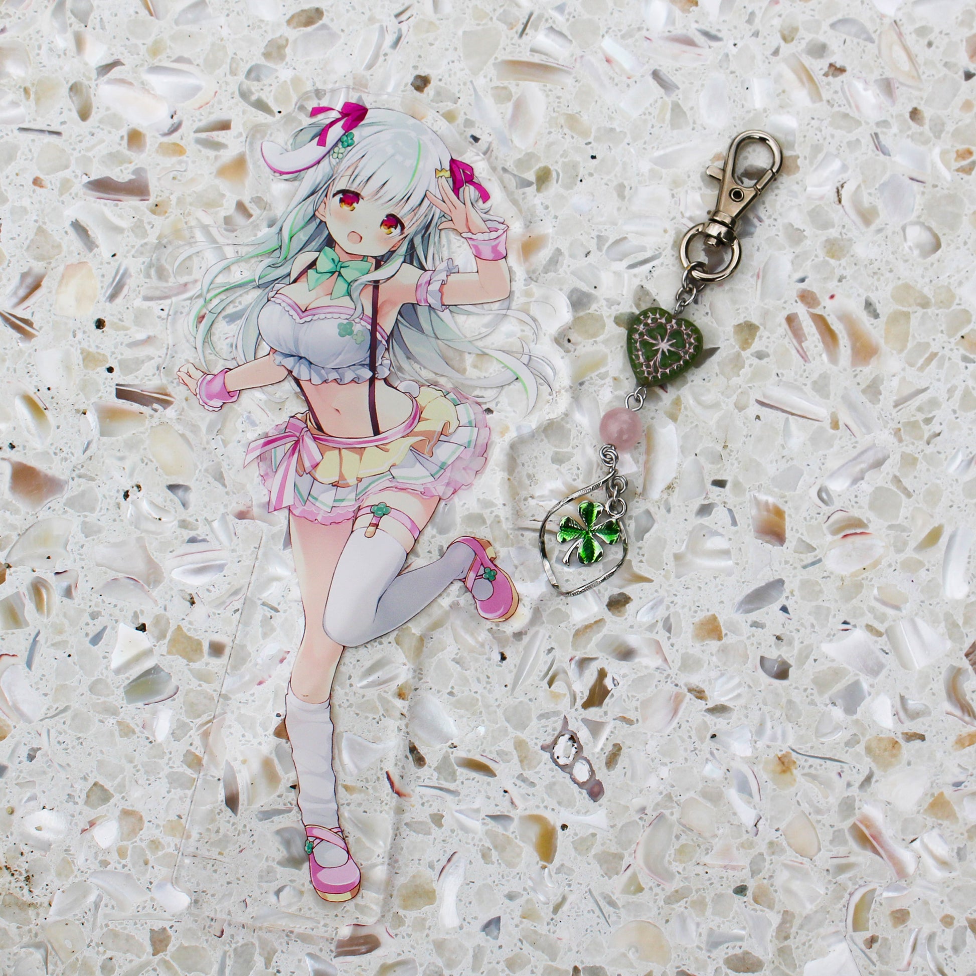 青リンゴを思わせるハートのドイツ製パーツを使用し、四つ葉のクローバーチャームをツイストドロップパーツで囲むことで[永遠]を表現。「ファンの皆さんにずっと持っていてもらえるようなデザインにしたい」という愛咲さんの想いを汲んで、シンプルかつ丈夫に仕上げさせていただきました。