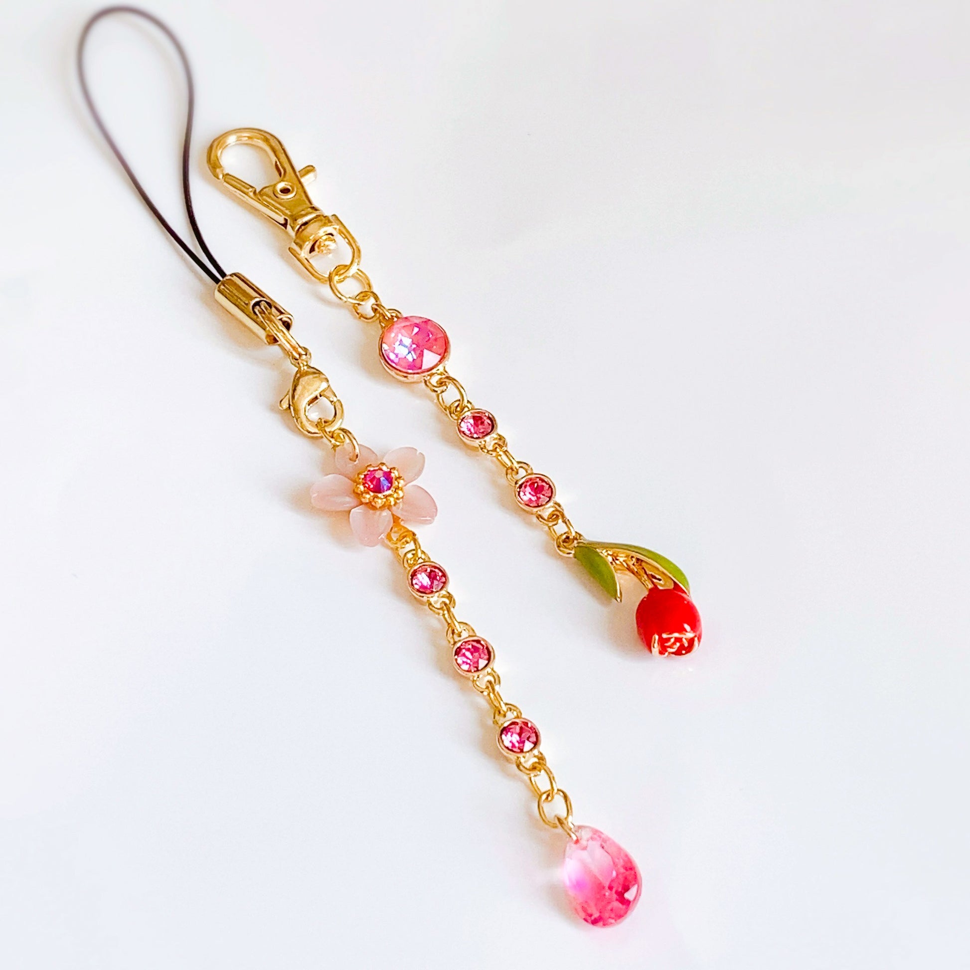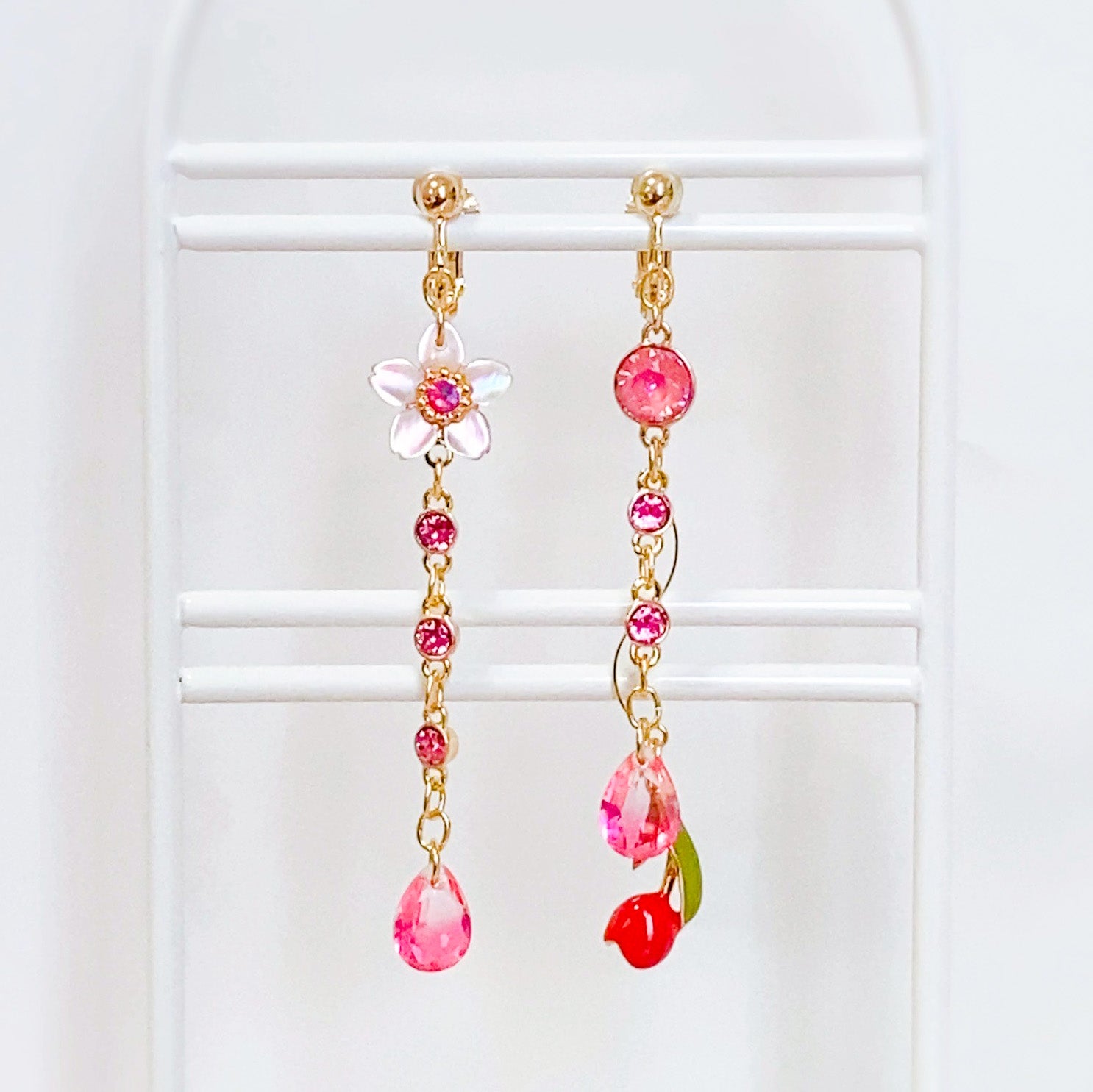 ピンクのクリスタルとシェル素材の桜チャーム、可憐に咲くチューリップが耳元で揺れるデザインに仕上げました。