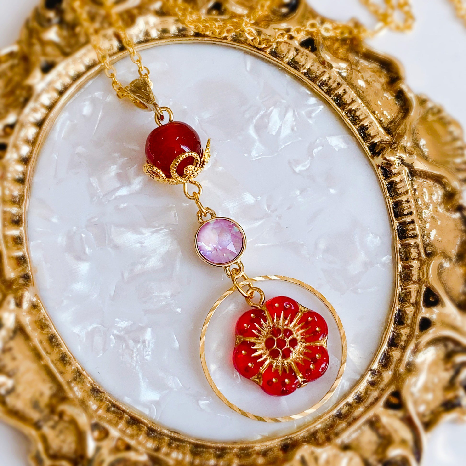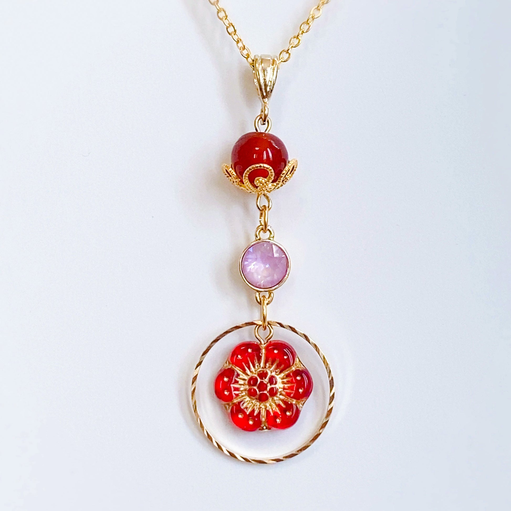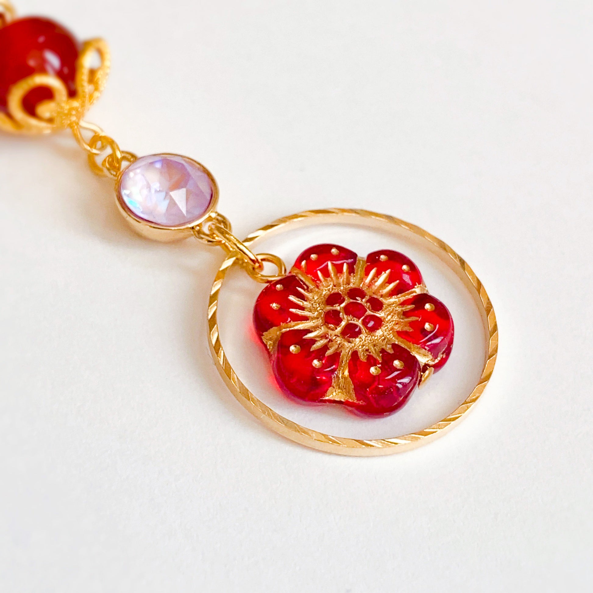 花緒ミズキさんらしさをたっぷりと盛り込んだ逸品。メインは最上部の天然石[カーネリアン]。小ぶりながら力強いの石を花座で飾ることにより、楚々とした愛らしさがアップ。薄ピンクのクリスタルが中心できらめき、アネモネをかたどったチェコビーズが目を引きます。