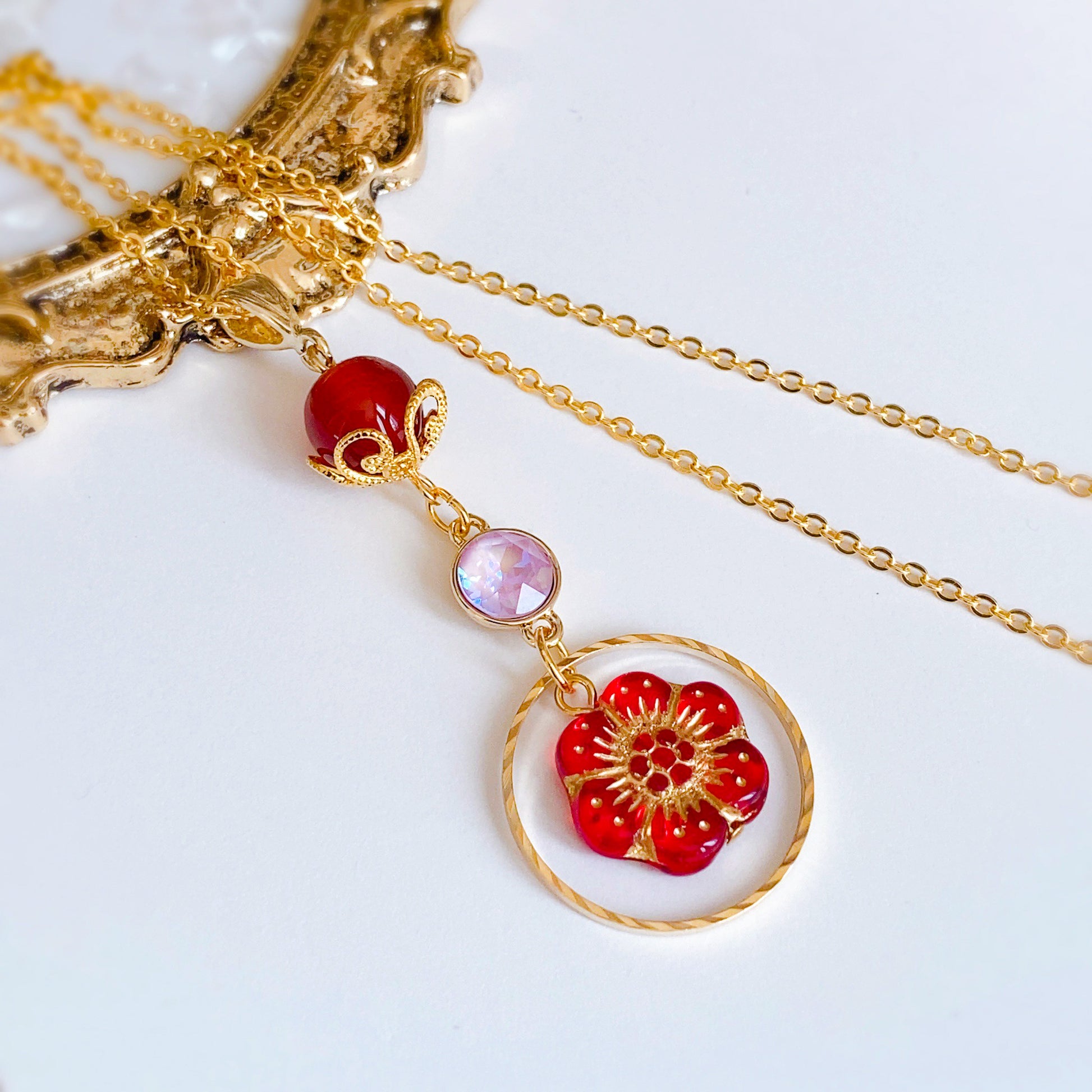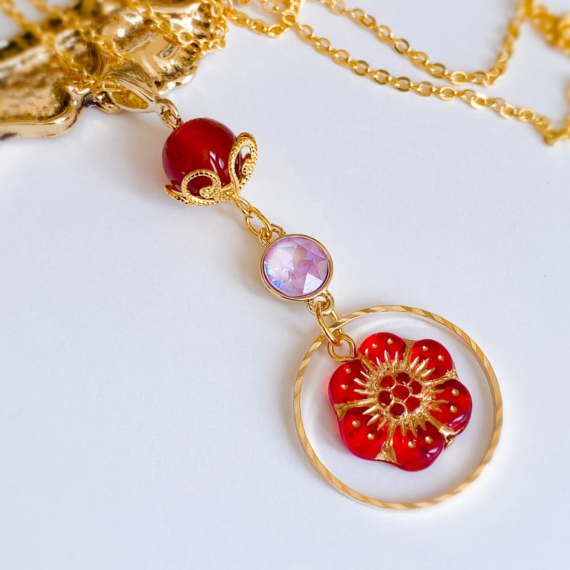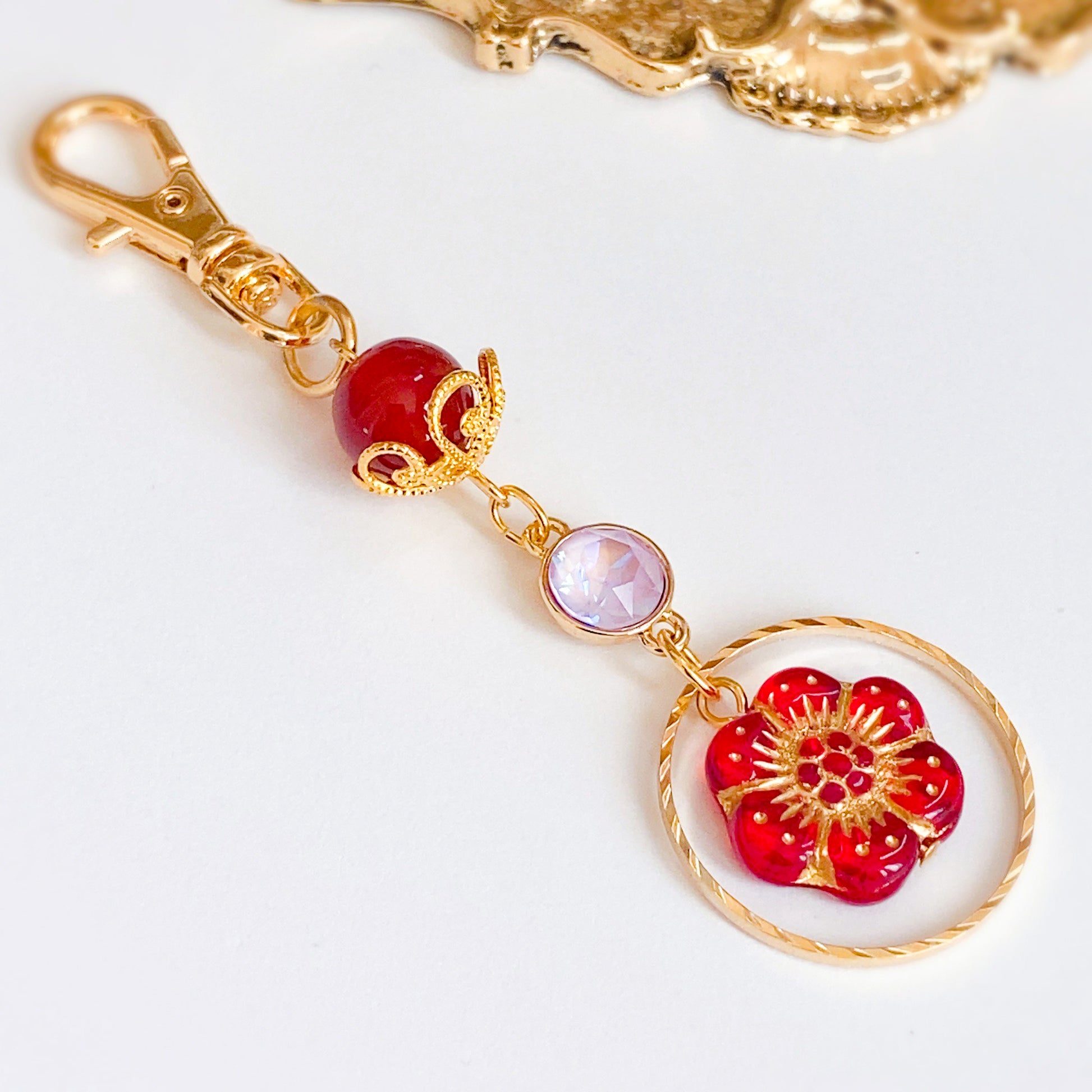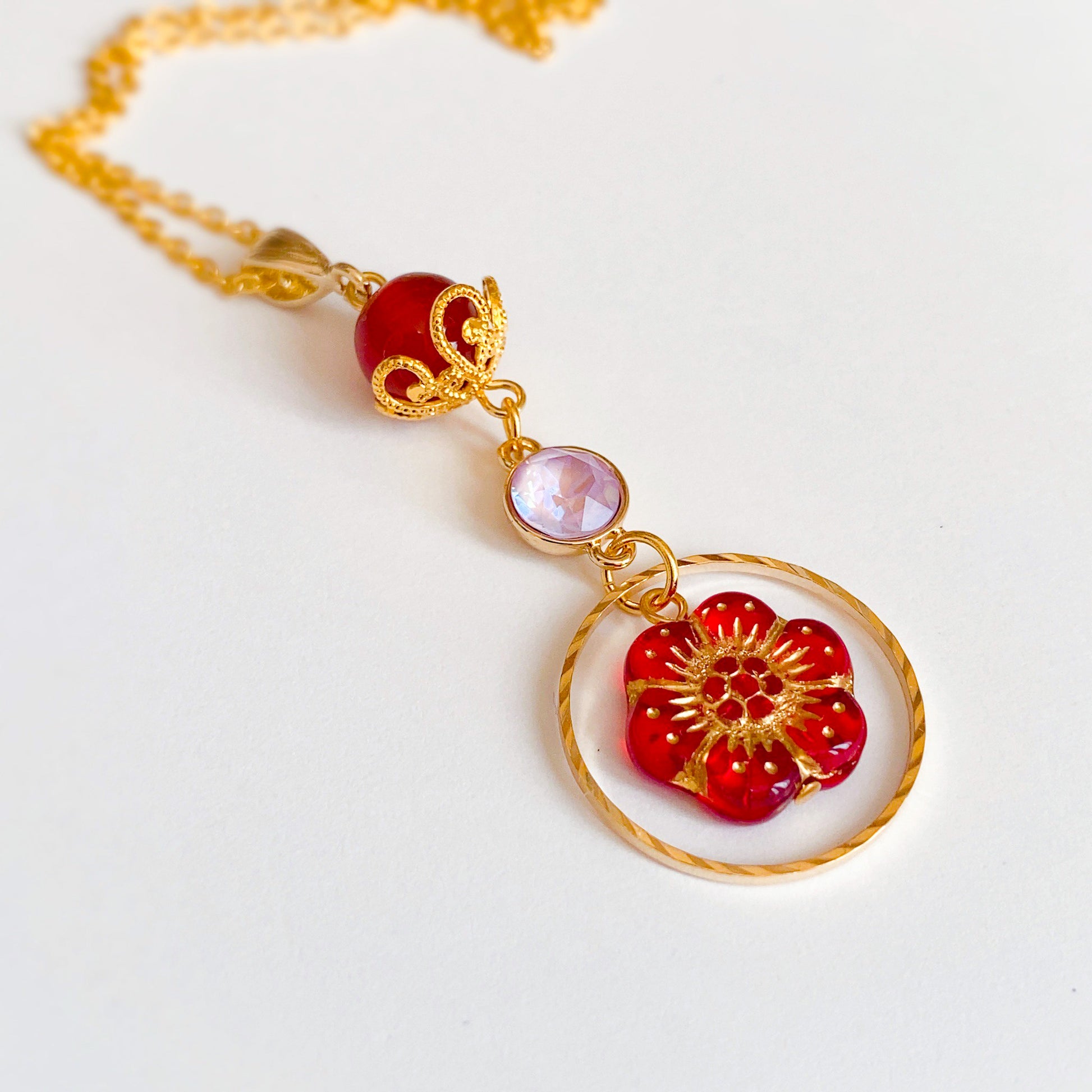 花緒ミズキさんらしさをたっぷりと盛り込んだ逸品。メインは最上部の天然石[カーネリアン]。小ぶりながら力強いの石を花座で飾ることにより、楚々とした愛らしさがアップ。薄ピンクのクリスタルが中心できらめき、アネモネをかたどったチェコビーズが目を引きます。
