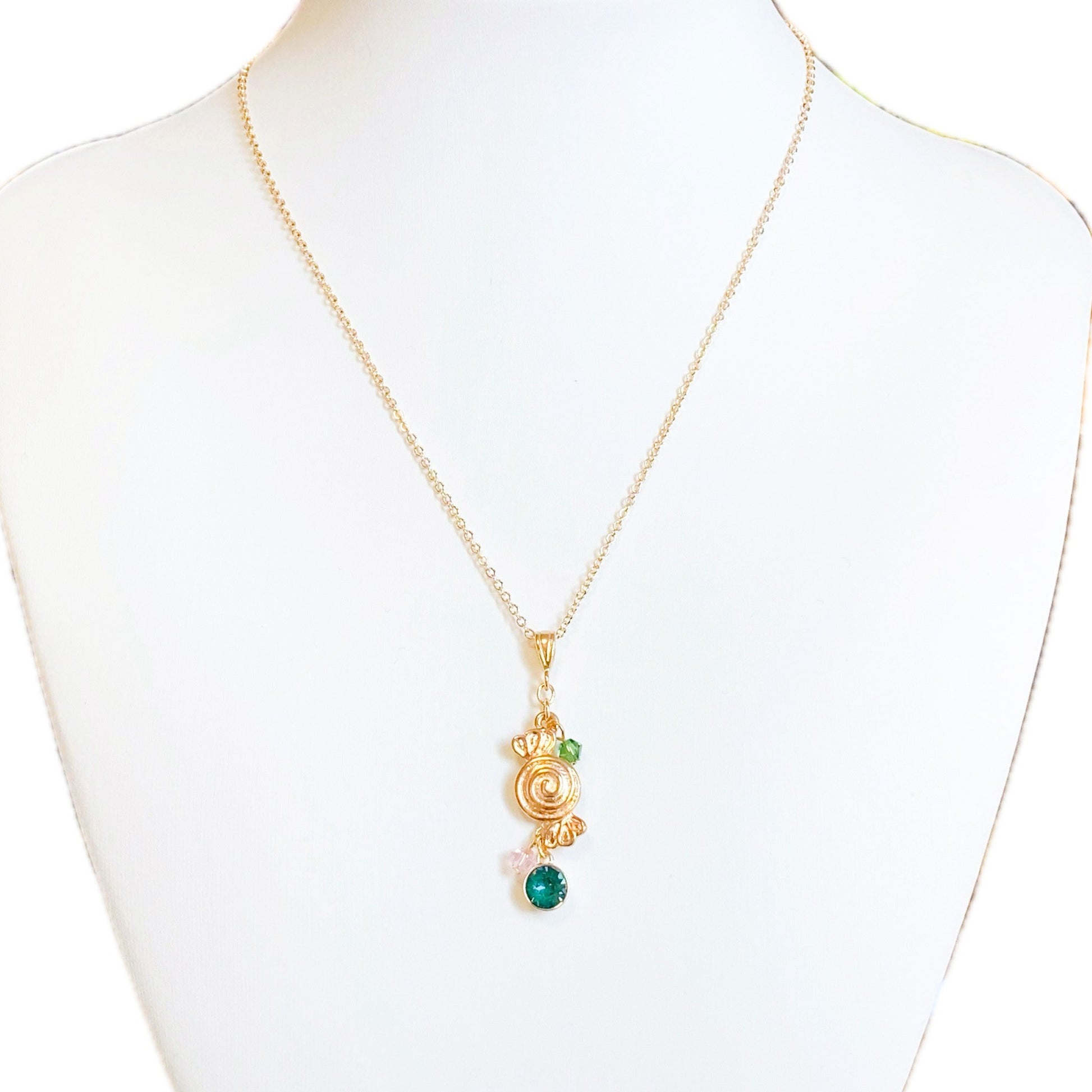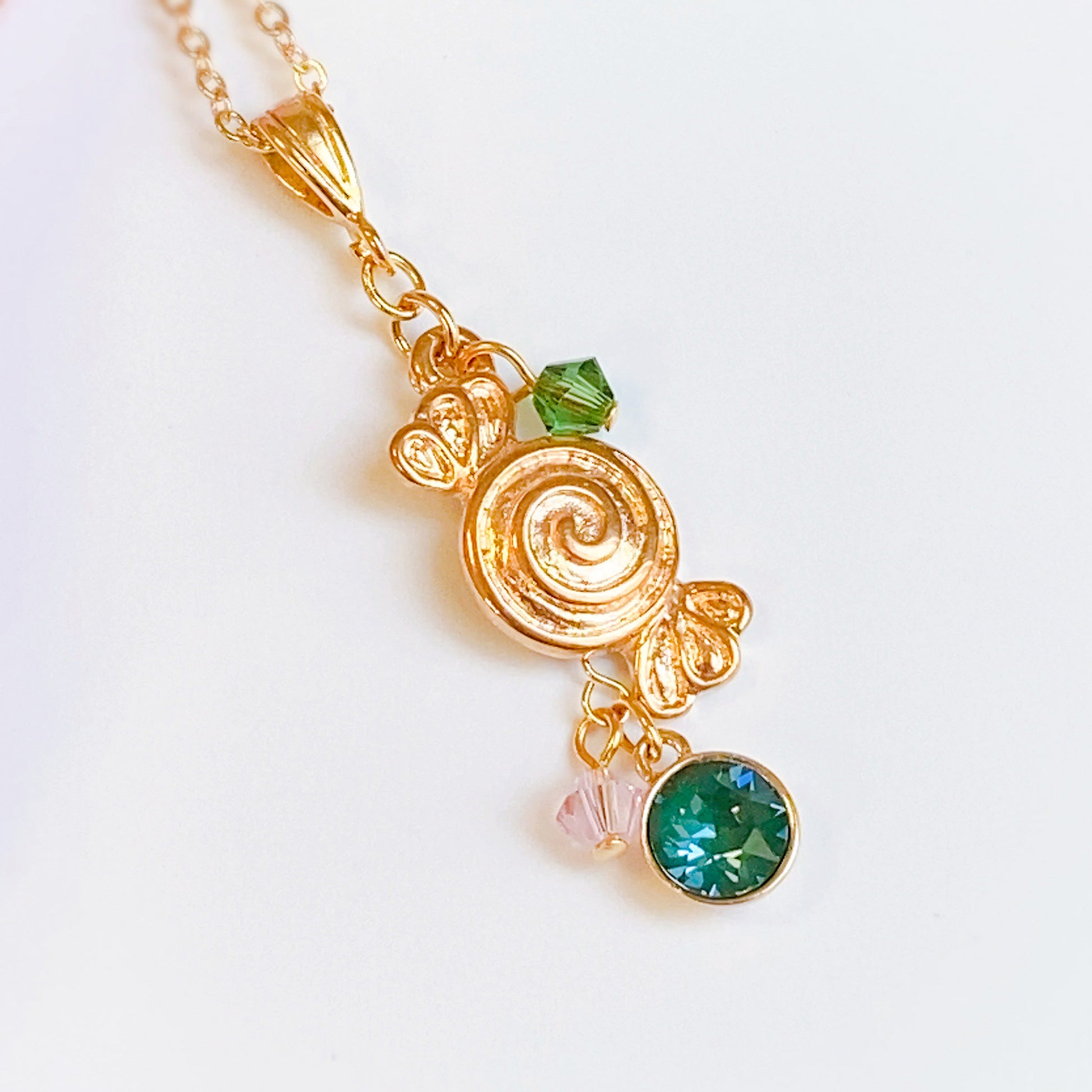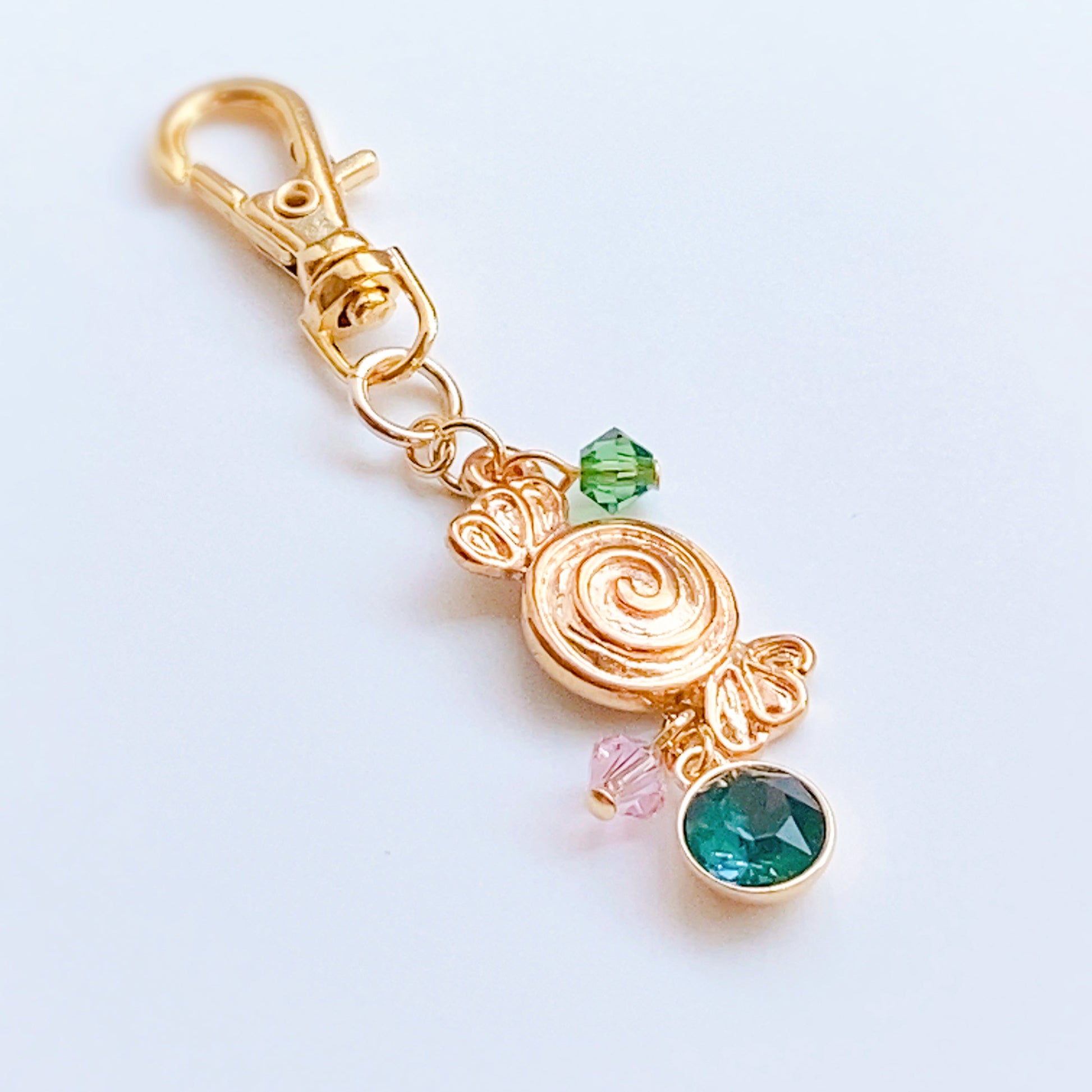キャンディチャームを主役に、その周りにグリーンのクリスタルと黄緑・ピンクのスワロフスキーを散りばめるように配置しました。