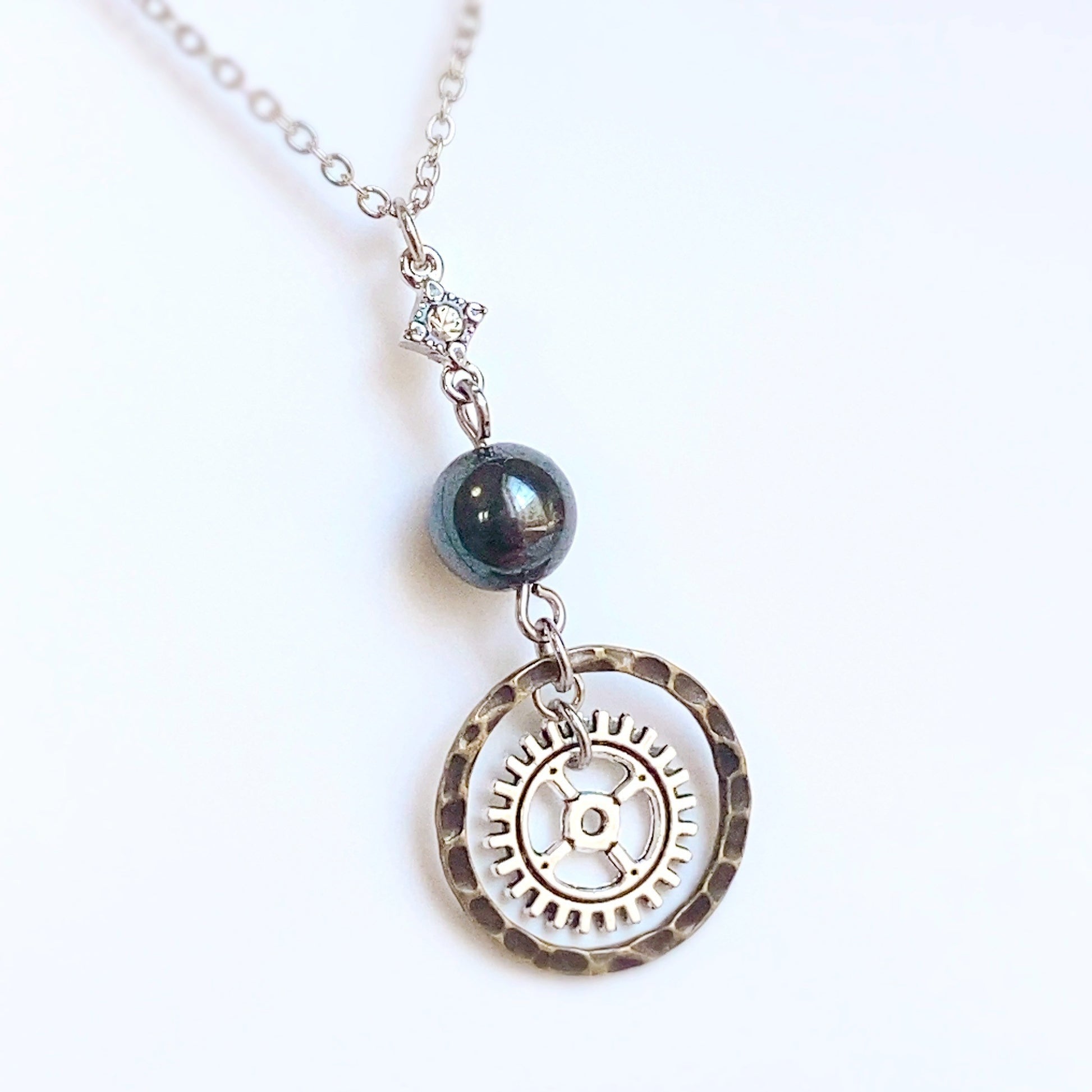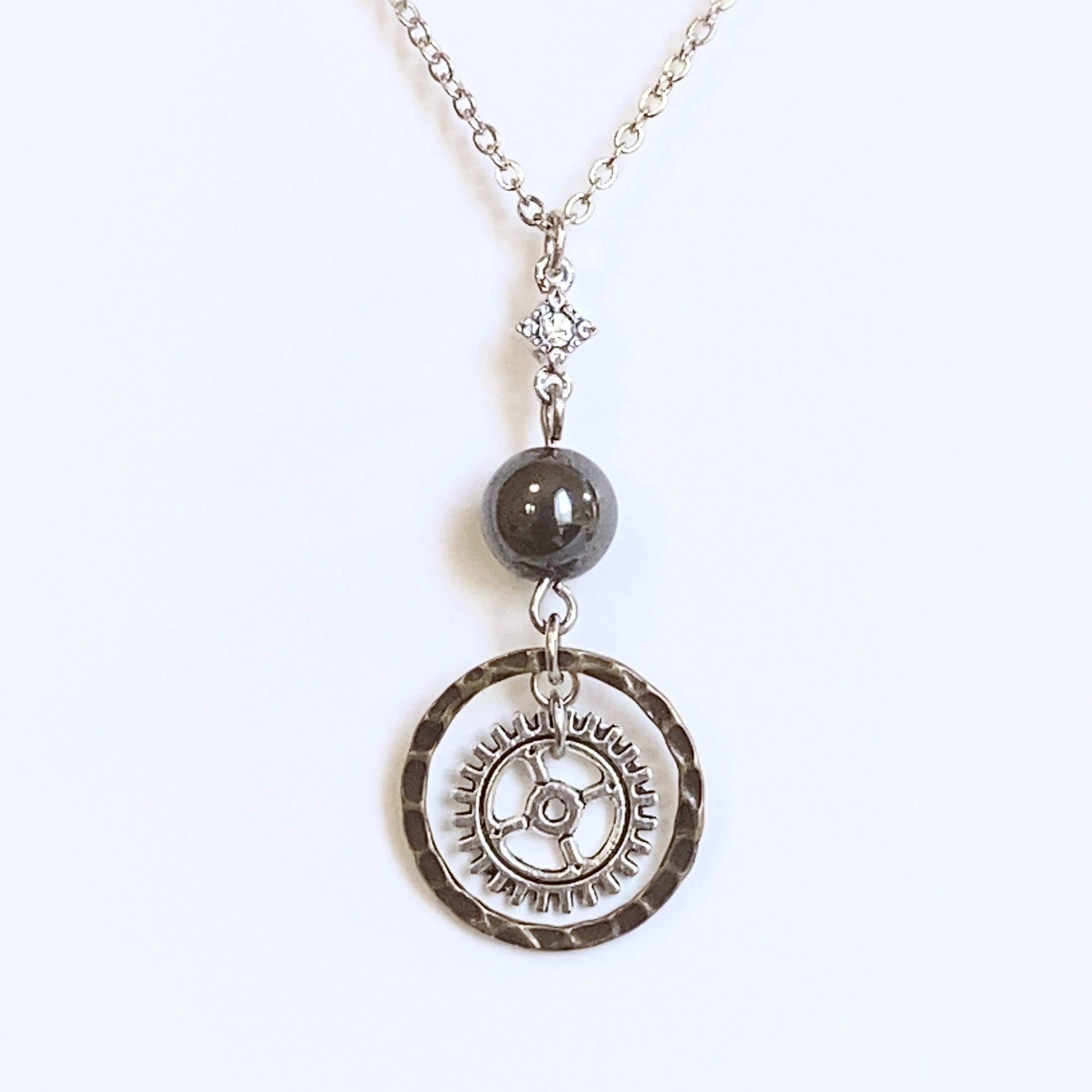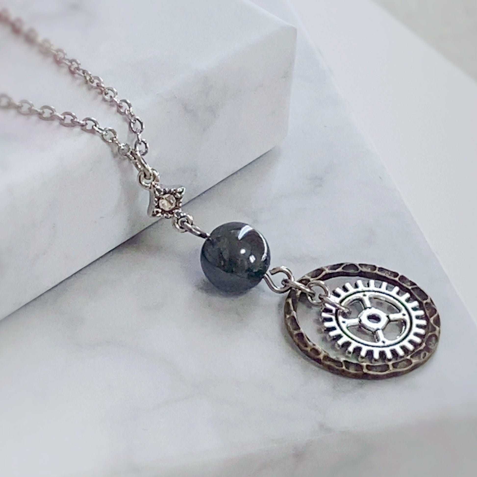 主役に使用したのは天然石の[ヘマタイト]。ヘマタイトは地に足のついた思考を促し、冷静な判断力を高める効果があるとされます。ISTPの持つ分析力や実践的なスキルを最大限に発揮するのを助け、重要な場面での集中力を強化します。