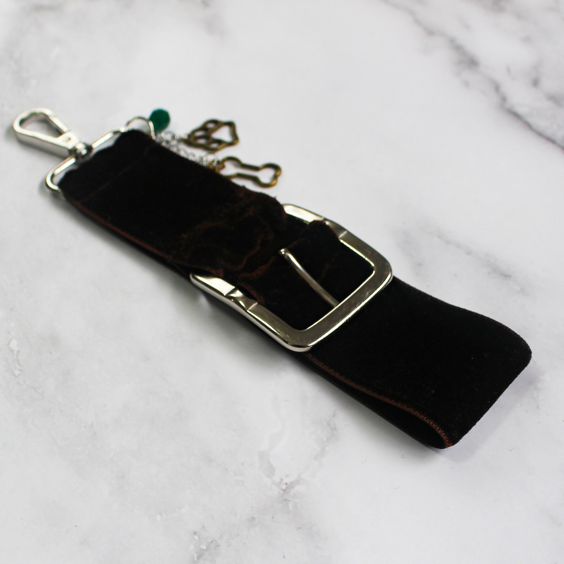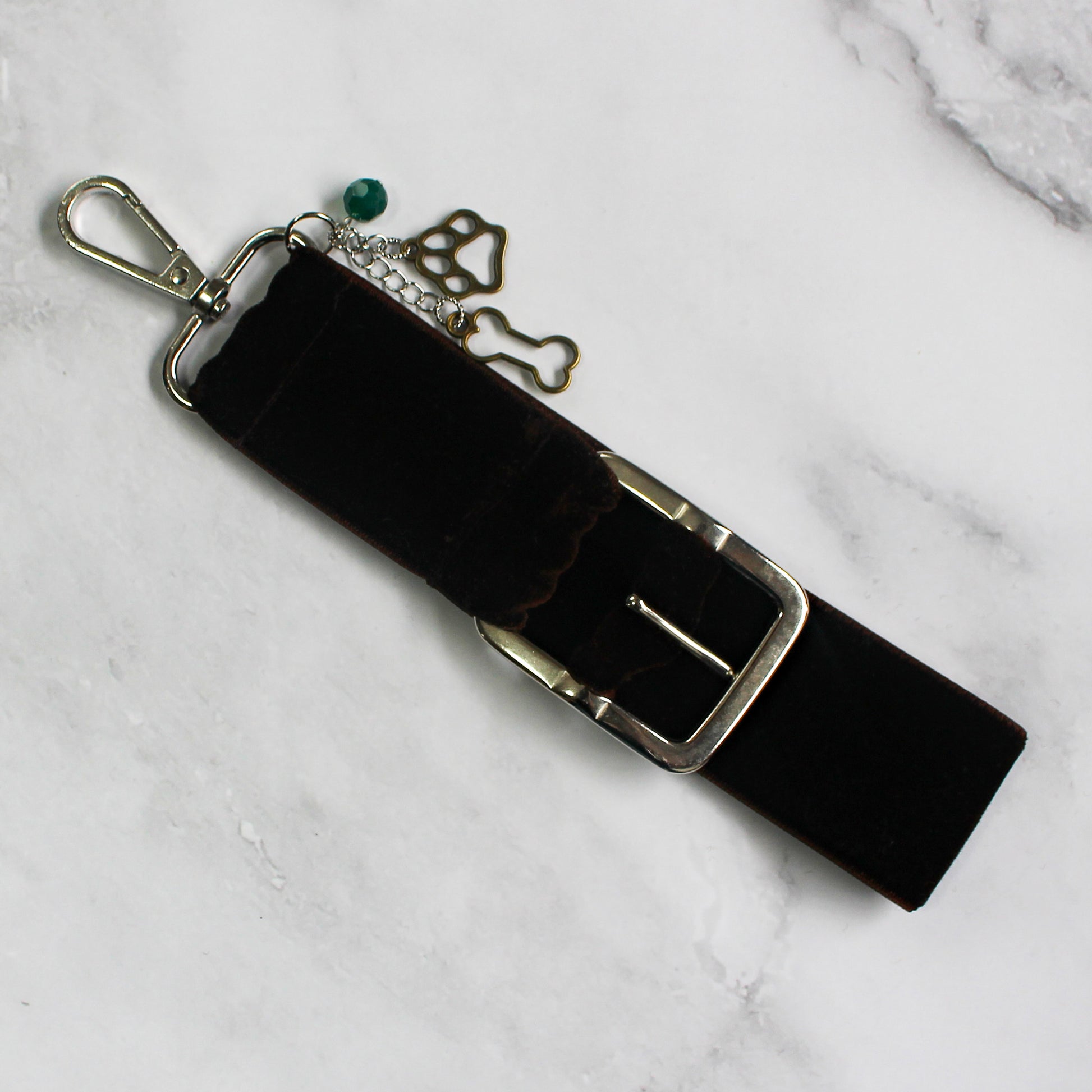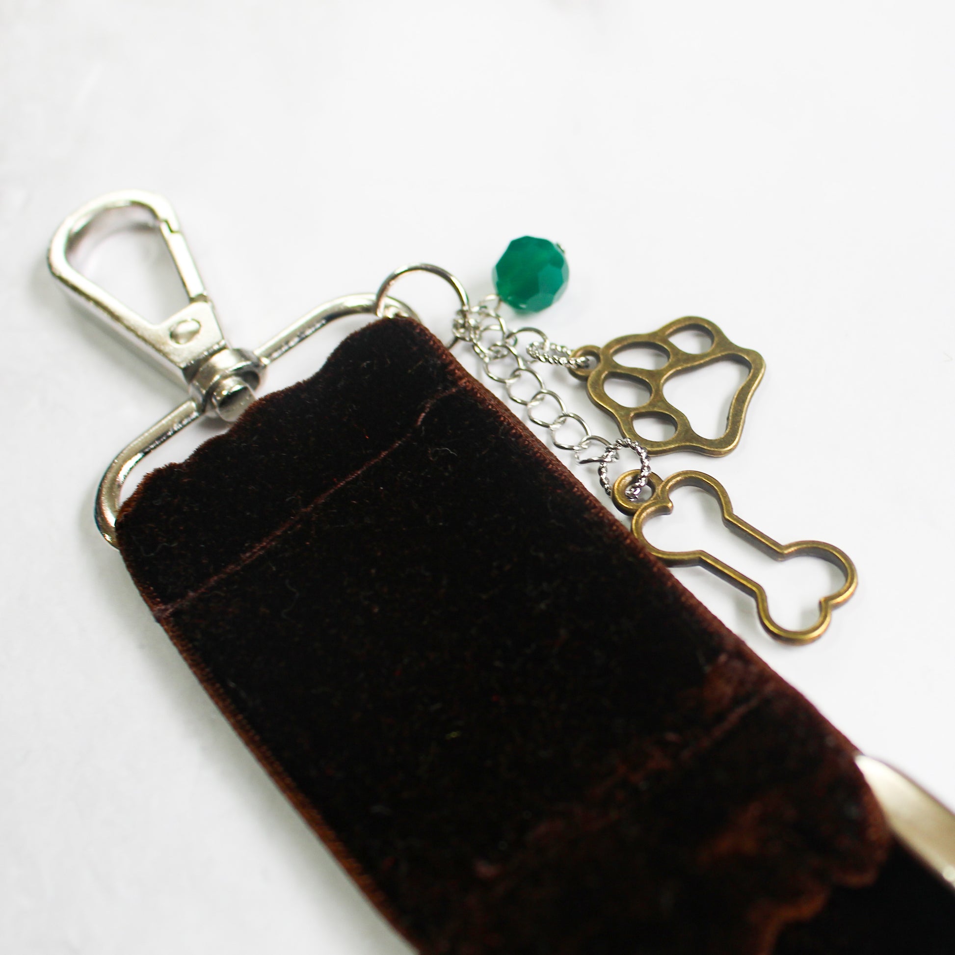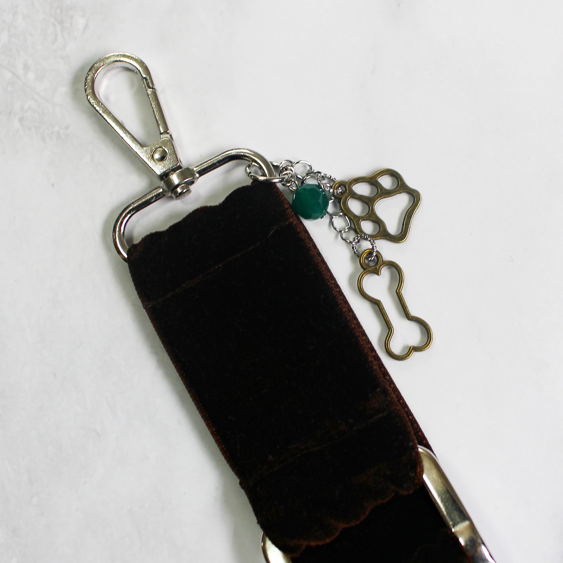 がろらくんの首輪をトレースしたベロア調生地のベルトストラップ。アンティーク(古美)の肉球・ほねチャームが揺れ、ラウンドカットの天然石[グリーンメノウ]が煌めきます。
