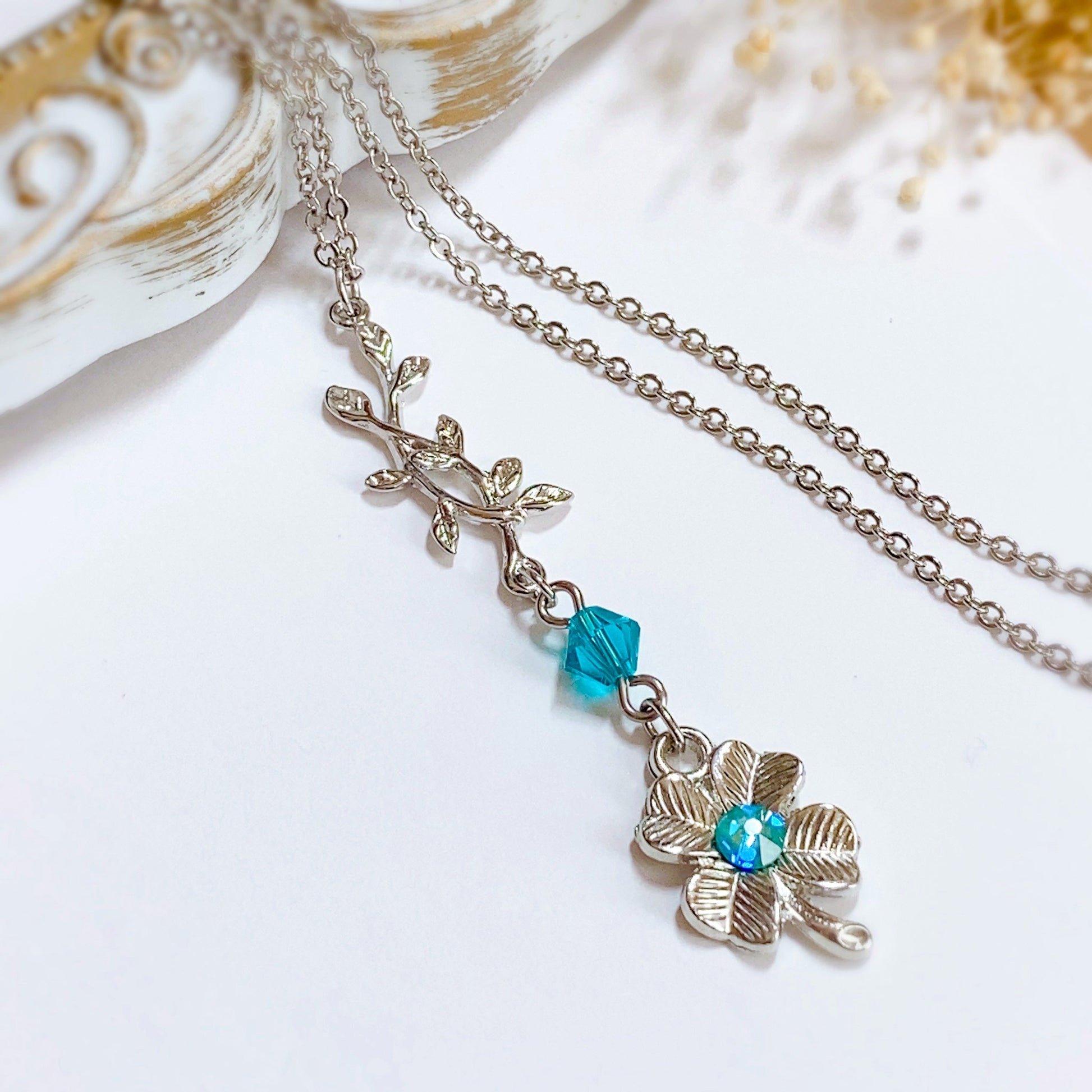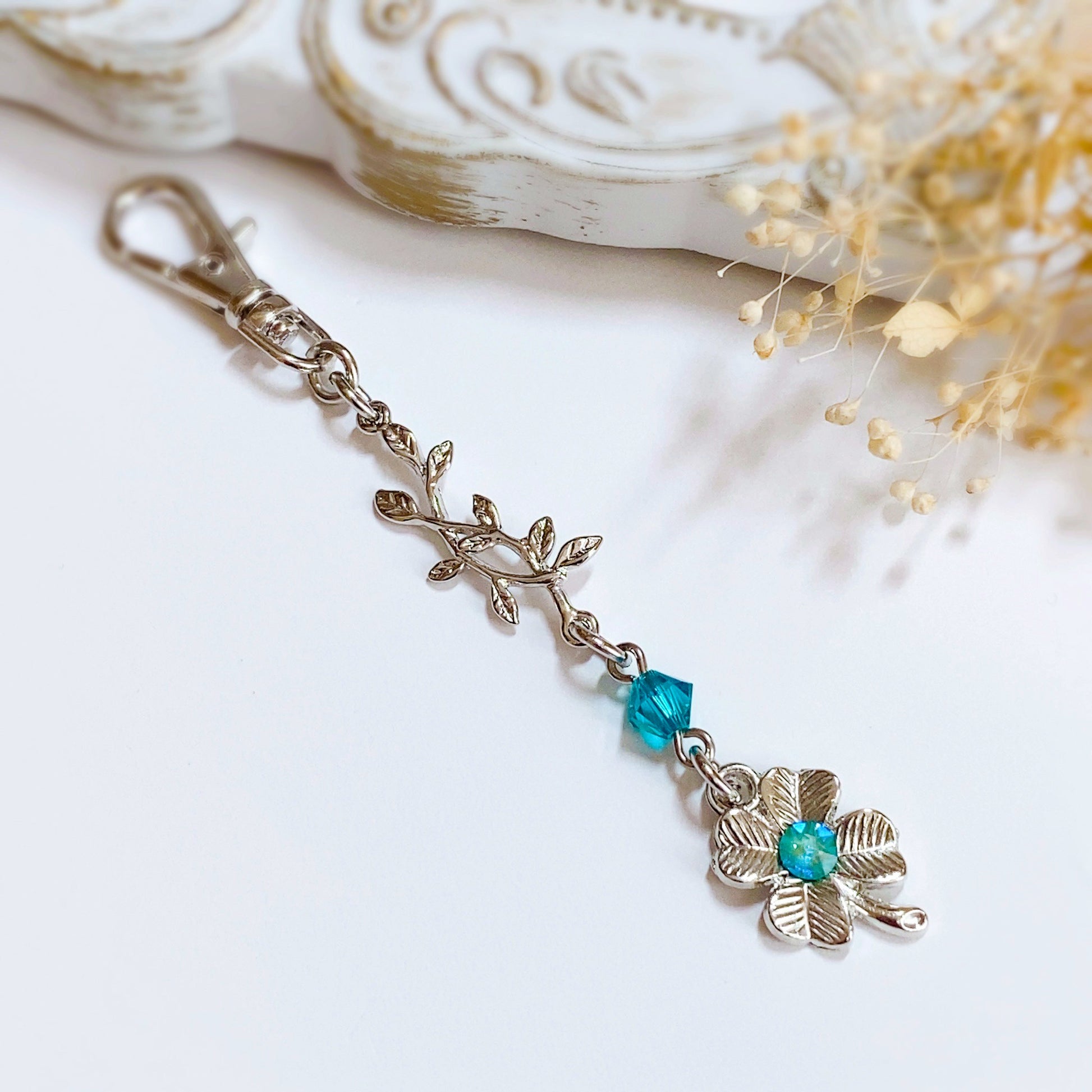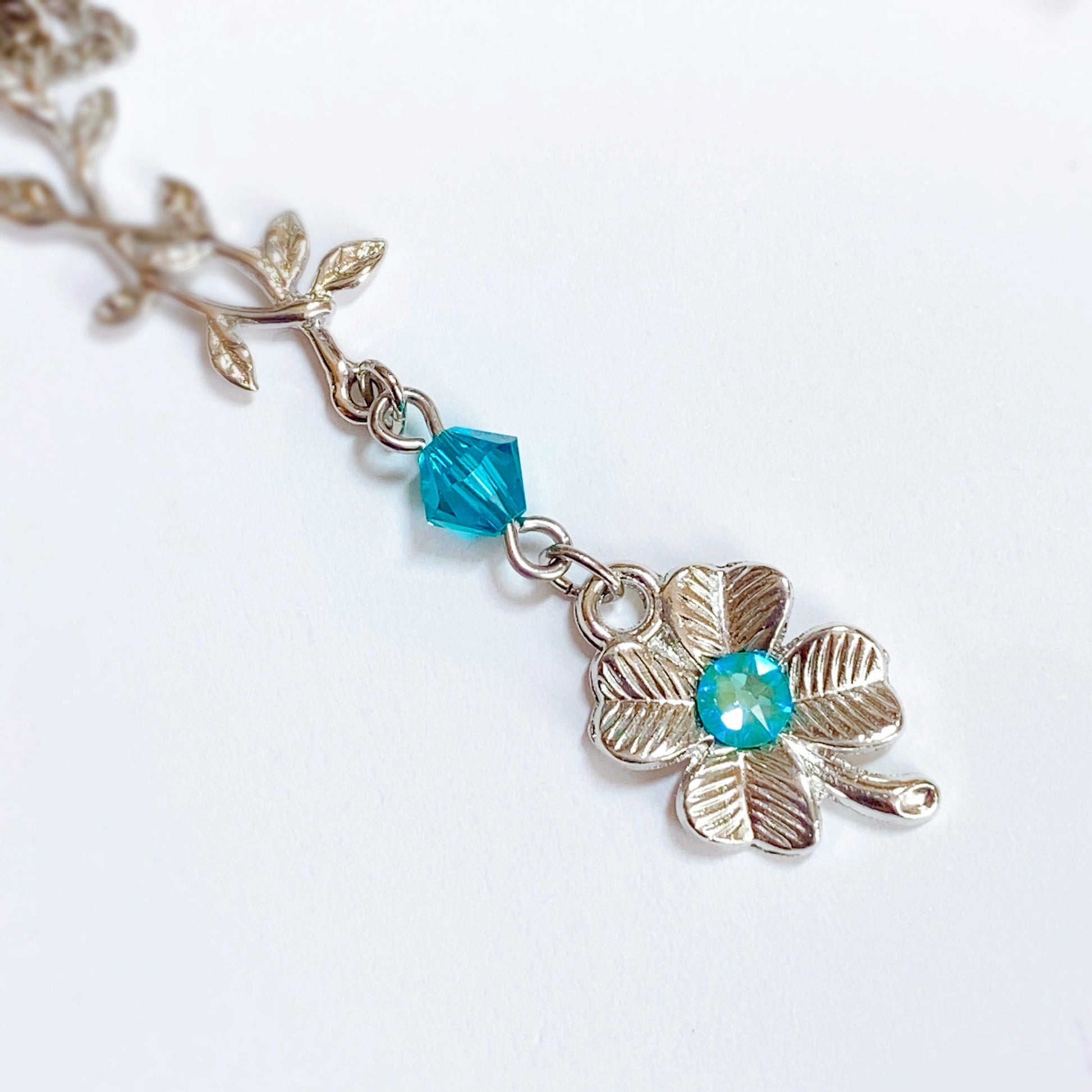 テーマカラーであるターコイズブルーを散りばめながらも、全体はシルバーでシック&クールに。リーフのチャームと四葉のクローバーが温かみを感じさせる、癒しのパワーを宿したアクセサリーに仕上がりました。