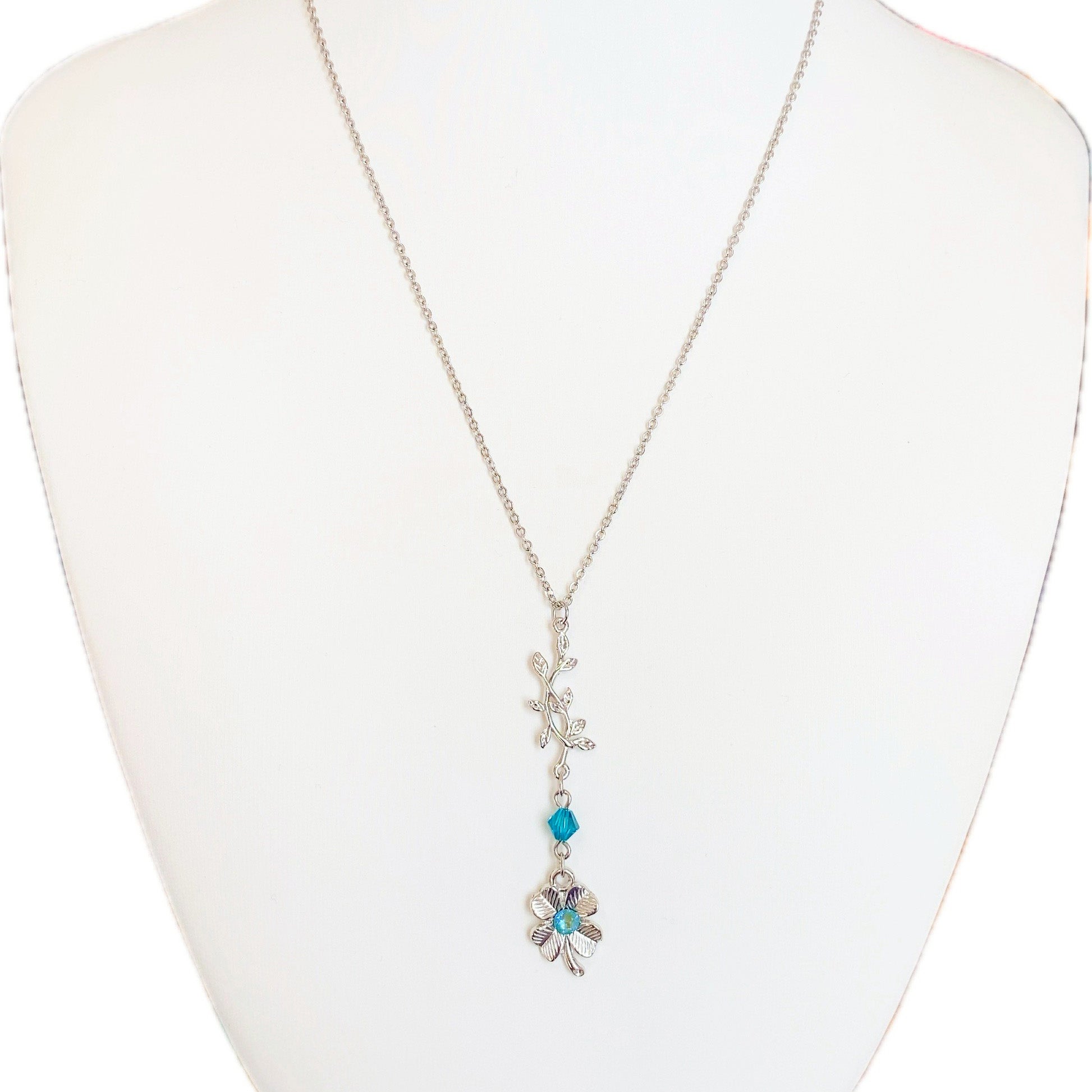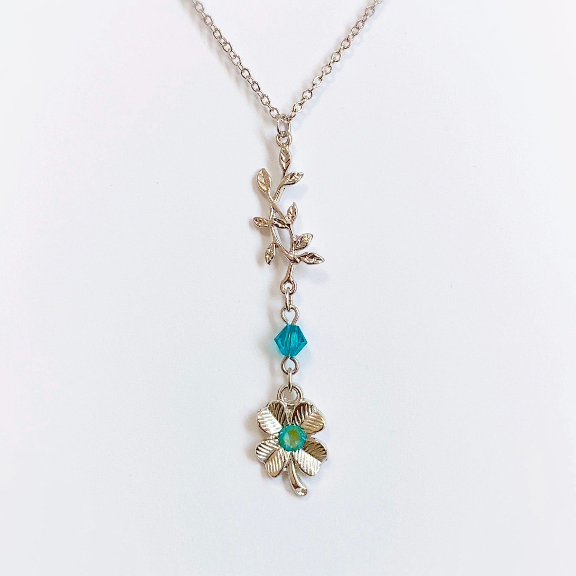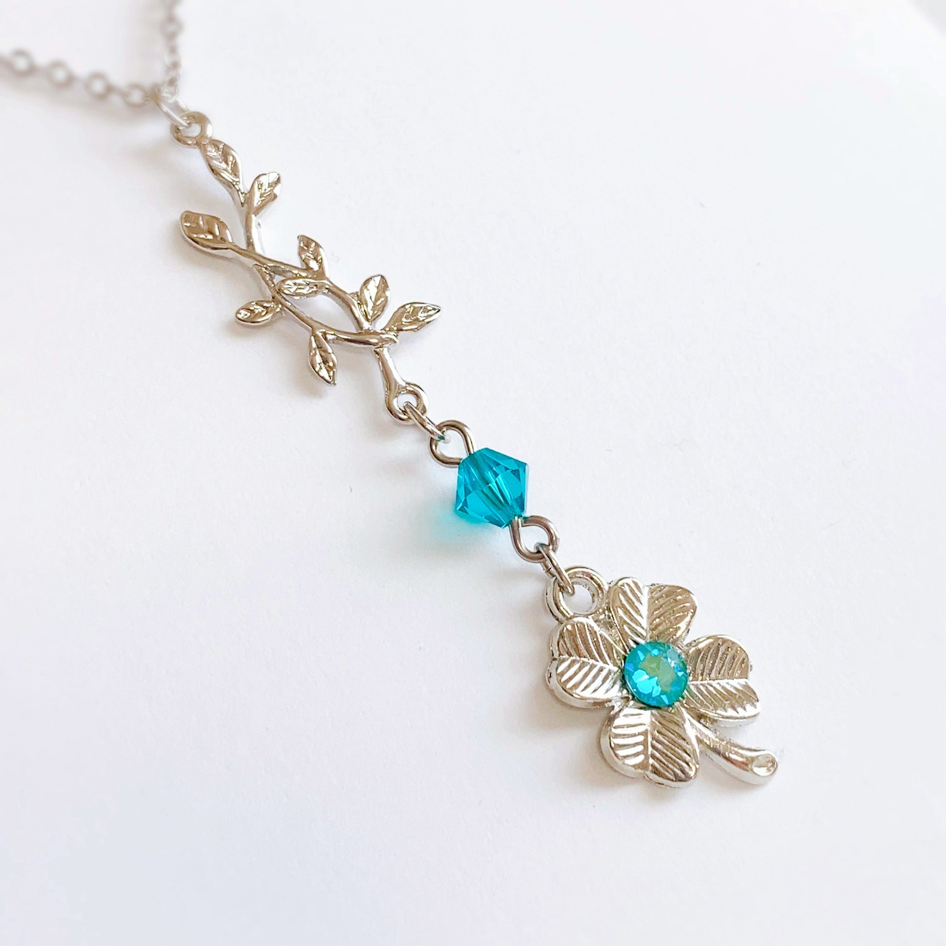 テーマカラーであるターコイズブルーを散りばめながらも、全体はシルバーでシック&クールに。リーフのチャームと四葉のクローバーが温かみを感じさせる、癒しのパワーを宿したアクセサリーに仕上がりました。