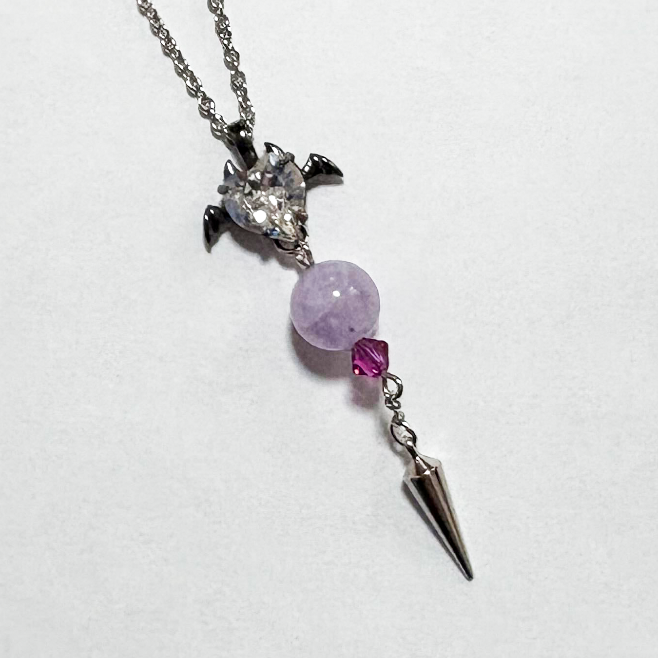 主役は天然石の[ラベンダーアメジスト]。Nanohaさんの声をイメージして、透明感と優しさを感じられる石を使用しています。ラベンダーアメジストは感情を整え、緊張をほぐす石。愛らしく癒しを届けてくれるその歌声の象徴として選びました。