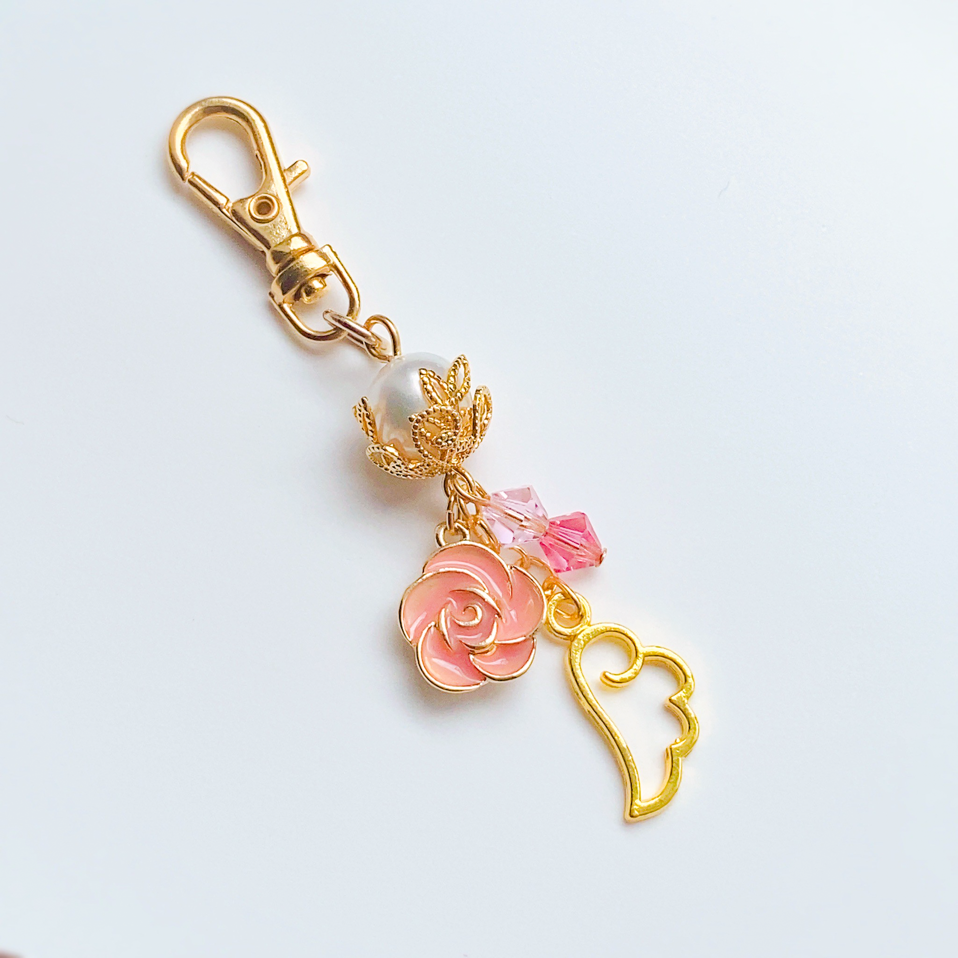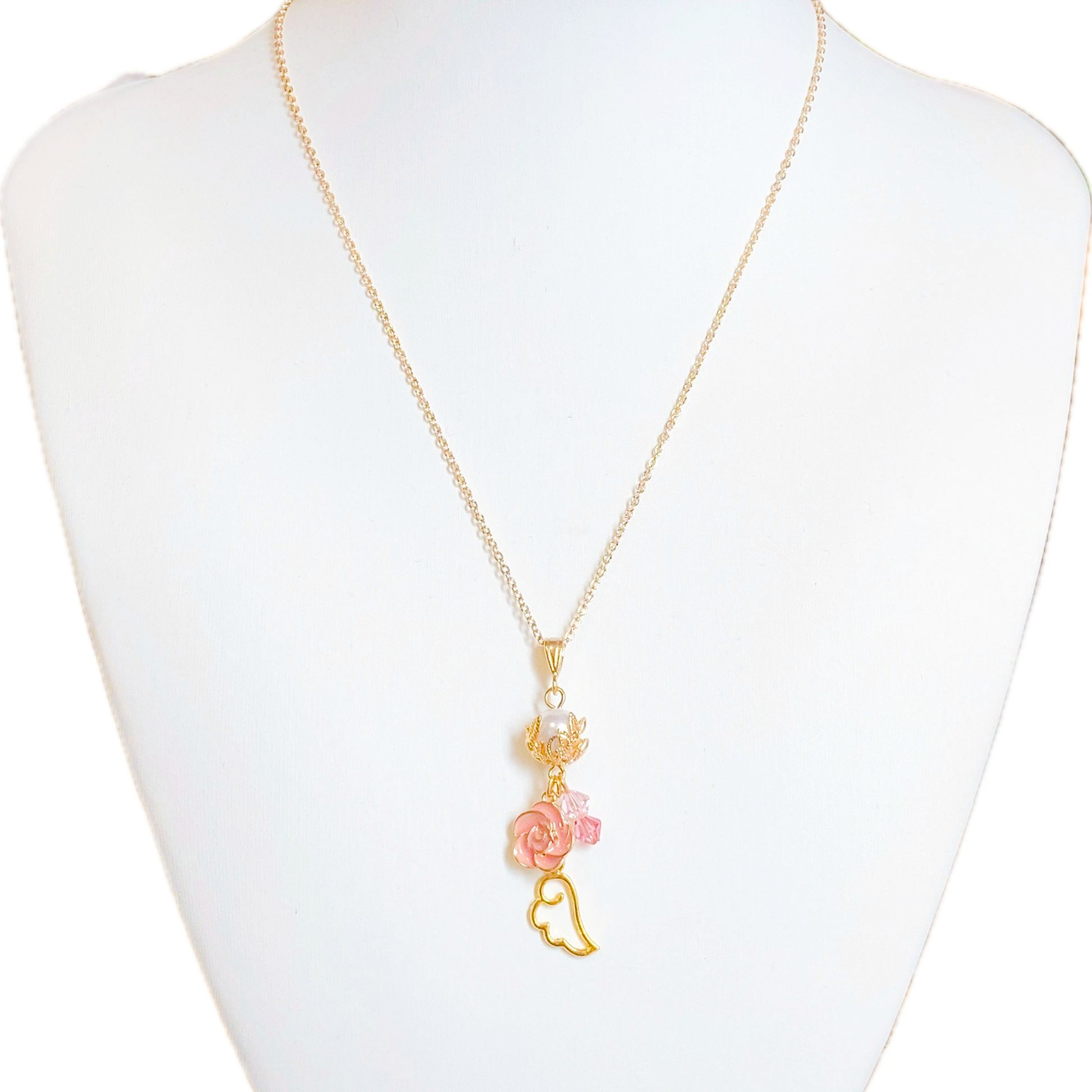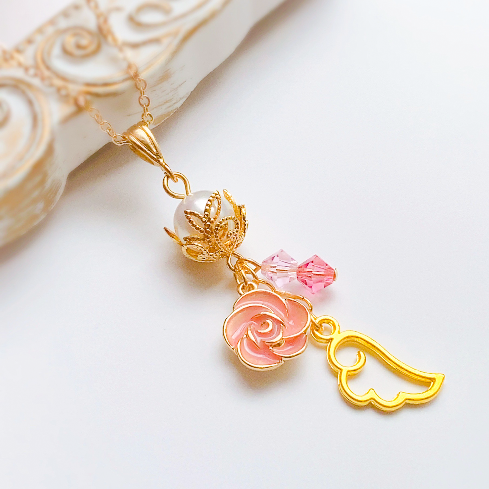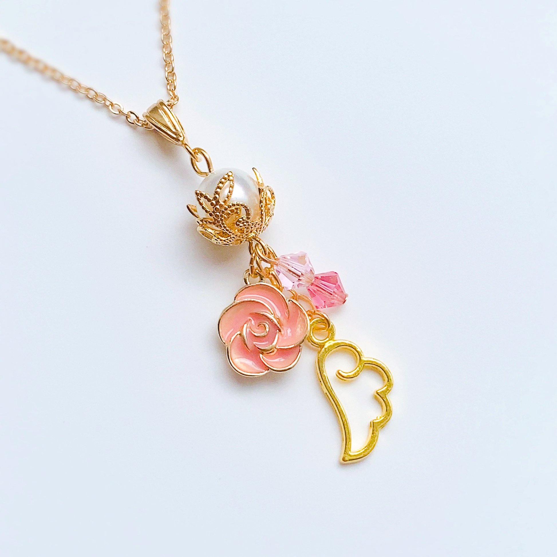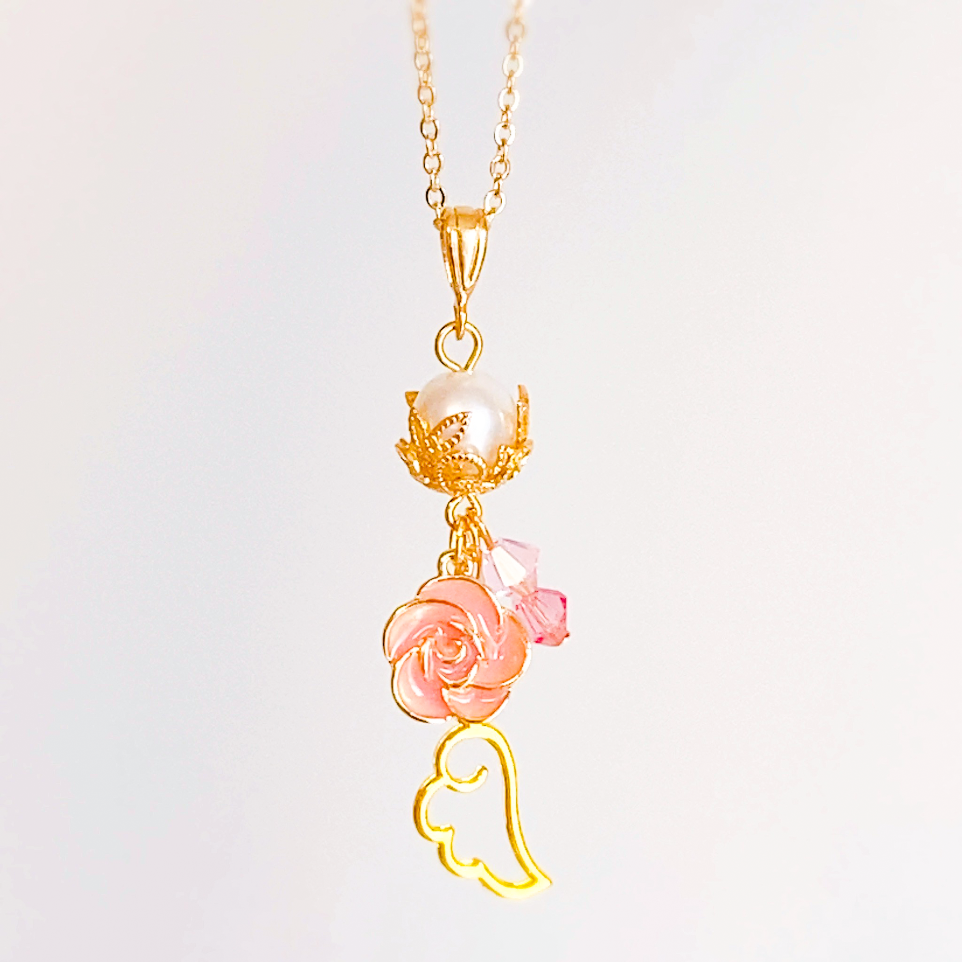 無垢なパール、ピンクのローズのチャームに愛らしい天使の羽。イメージカラーのスワロフスキーが軽やかにきらめく、潤主アシュリさんの概念がたっぷり詰まったイメージネックレスです。